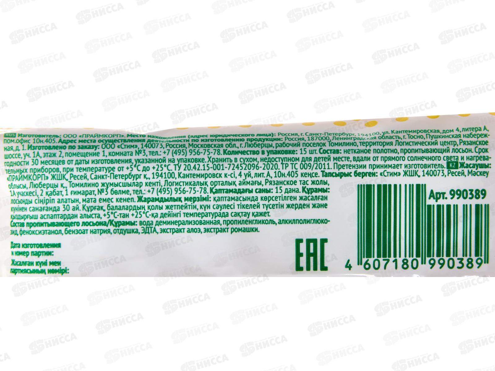 Состав: нетканое полотно, лосьон. Состав пропитывающего лосьона: вода деминерализованная, пропиленгликоль, алкилполиглюкозид, феноксиэтанол, бензоат натрия, отдушка, ЭДТА, аэкстракт алоэ вера, экстракт ромашки.