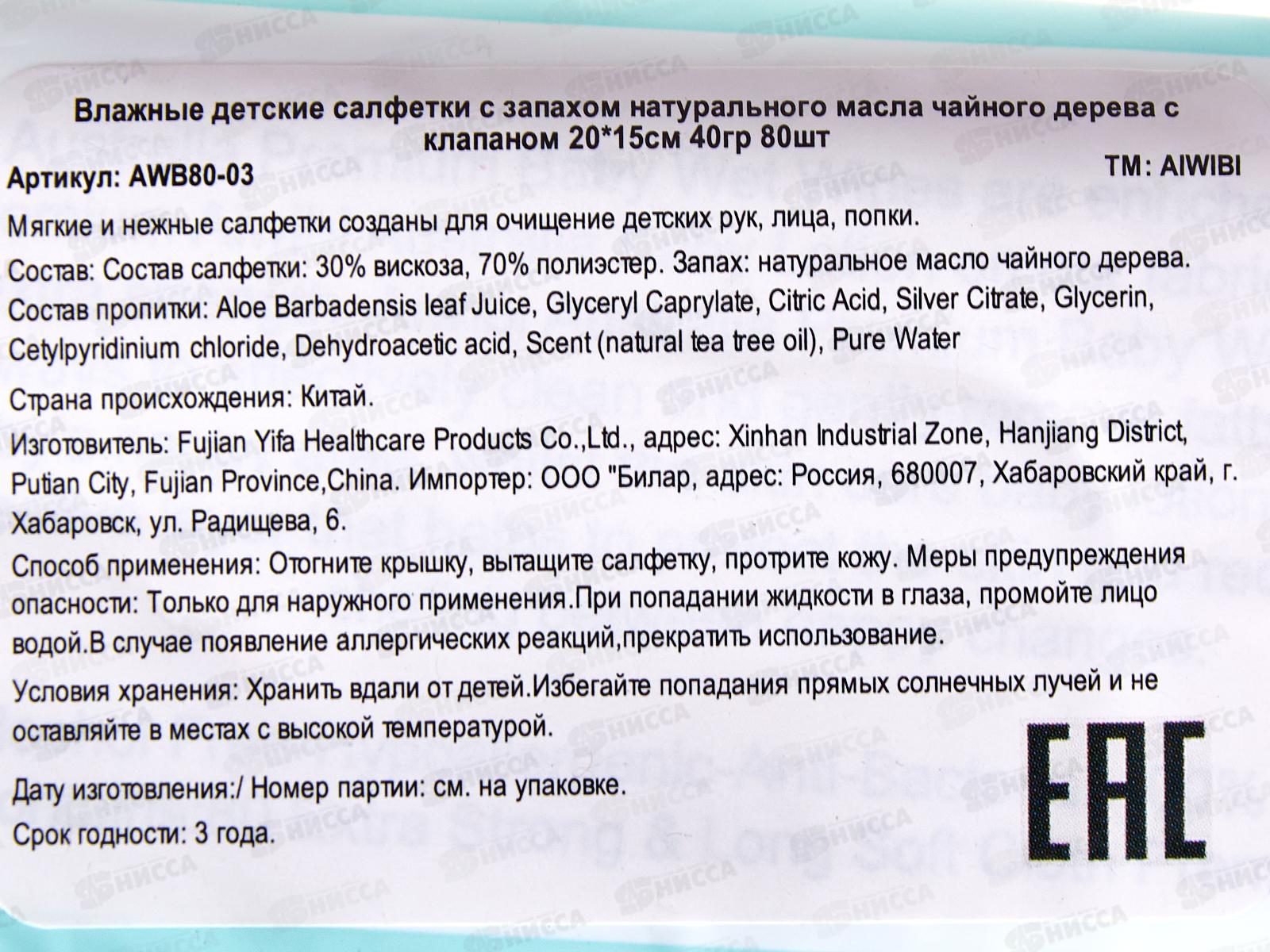 Aiwibi влажные салфетки детские Очищающие для чувствительной кожи 0+ 80шт Чайное дерево клапан *24