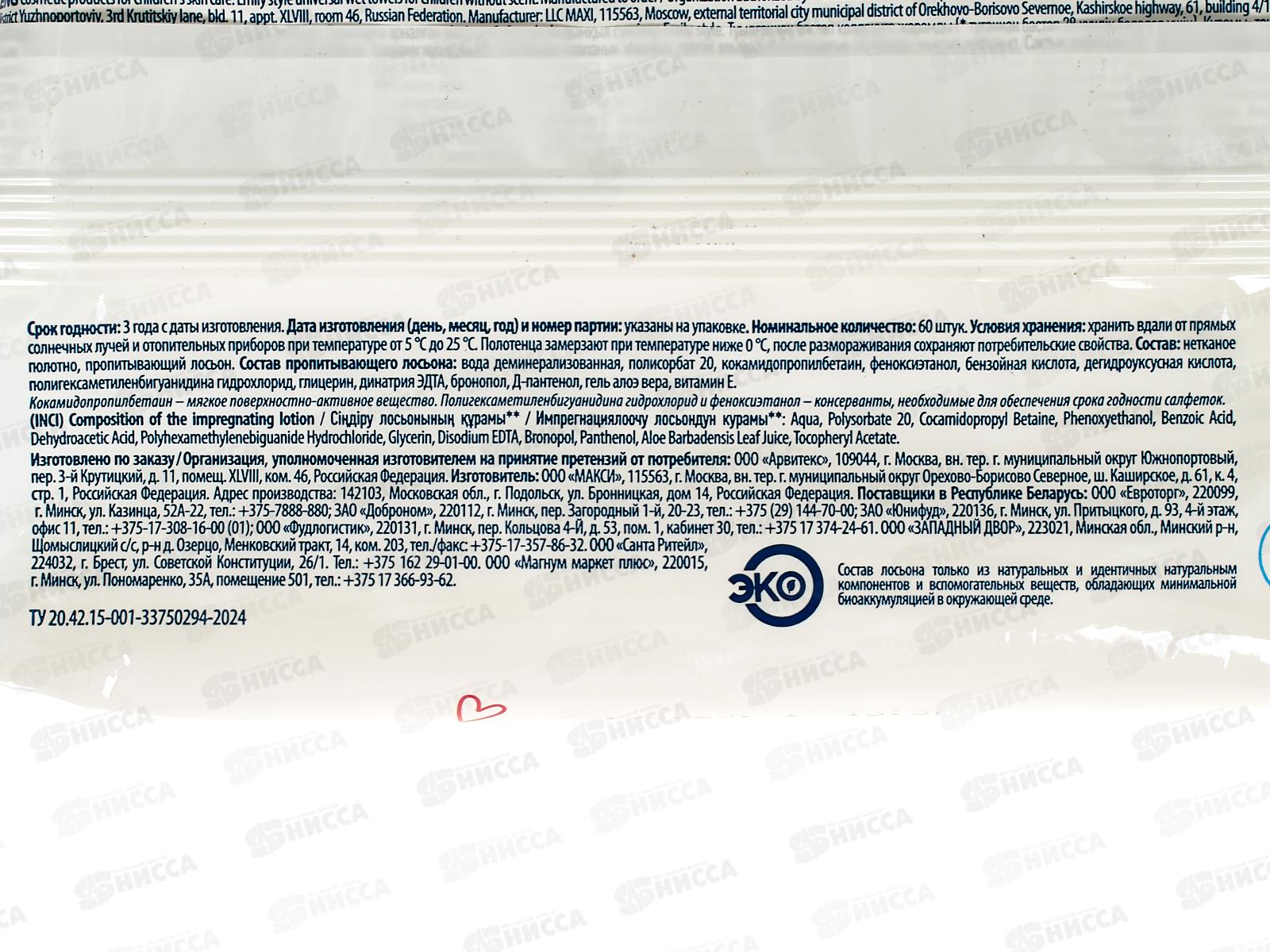 Emily Style Лайт Влажные полотенца Детские 0+ без отдушки XL 60шт