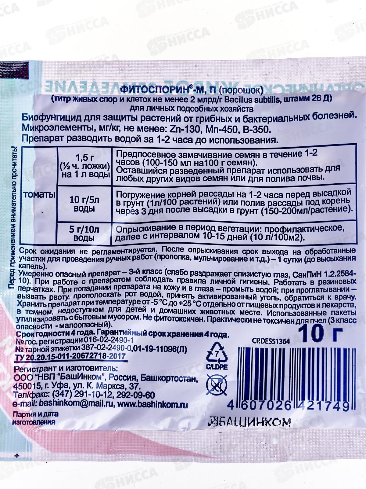 Биофунгицид, в основе которого – отселектированные, отобранные природные фитобактерии от болезней томатов и других пасленовых культур в споровой форме, проникающие в ткани растений и вырабатывающие биологически активные вещества для их защиты и стимуляции. Защищает от гнилей, парши, черной ножки, фузариоза, фитофтороза, бактериозов, мучнистой росы и др. болезней томатов, перцев и баклажанов.