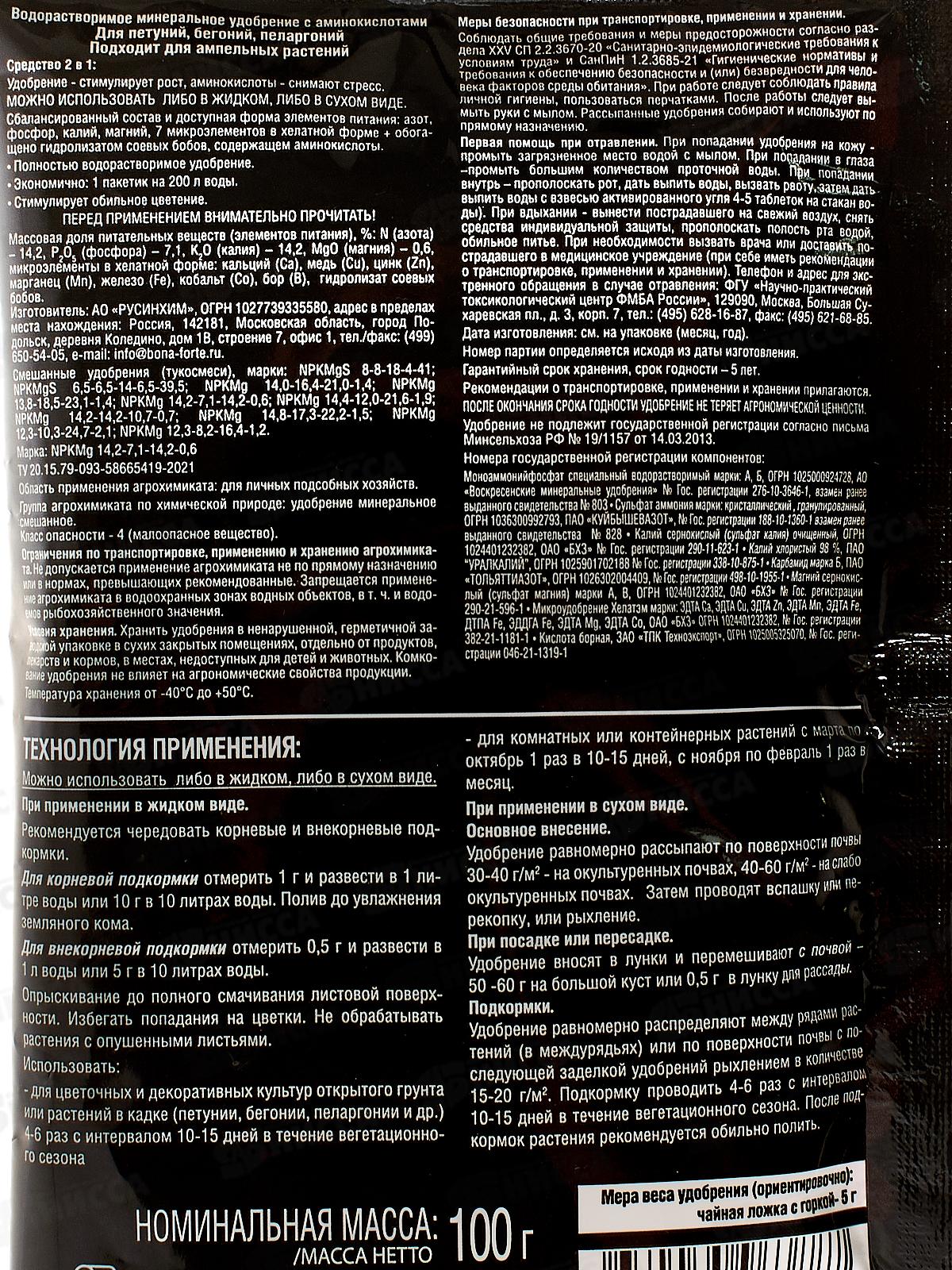 Компоненты: азот - 14,2%, фосфор - 7,1%, калий - 14,2%, магний - 0,6%