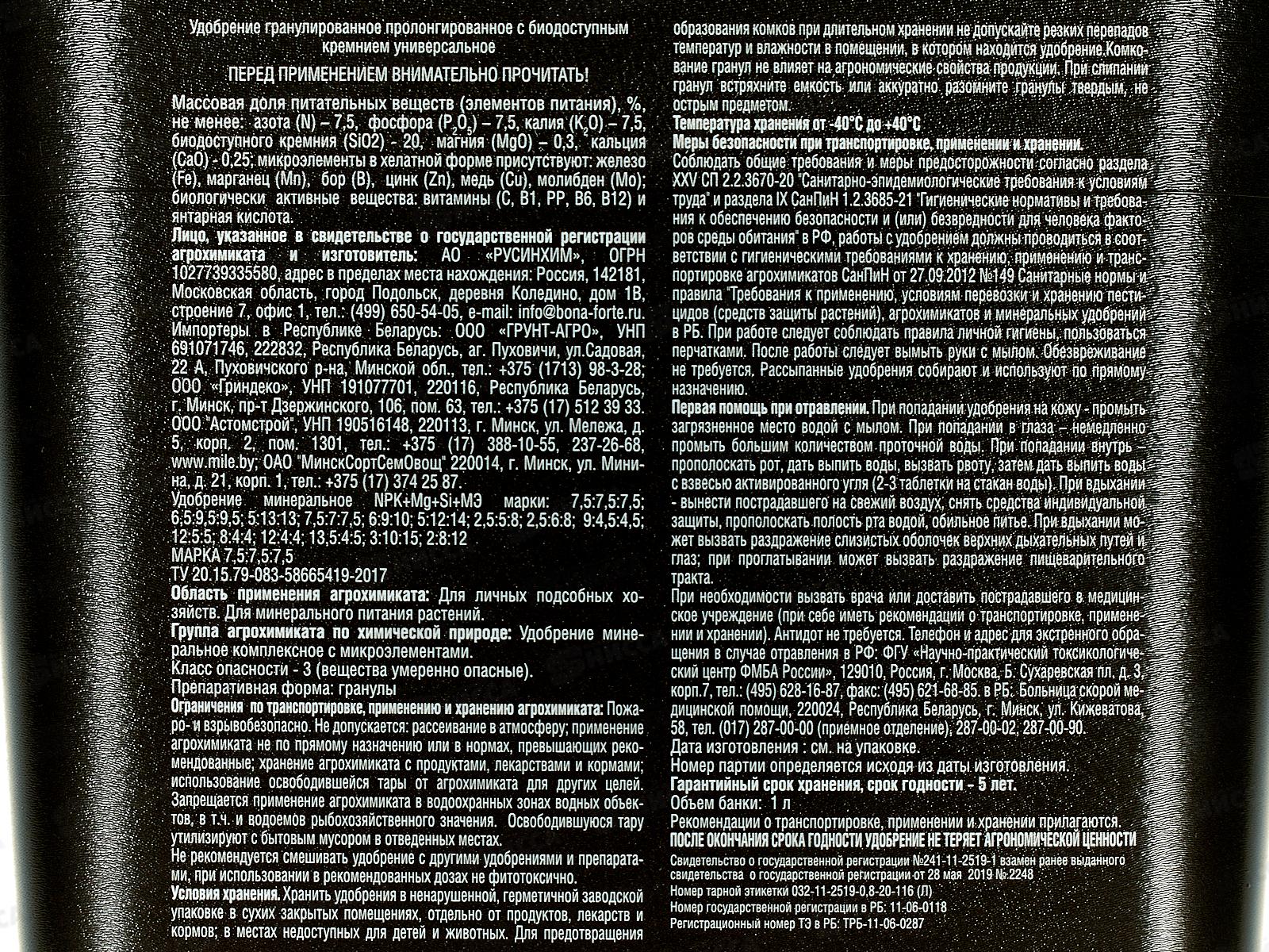 Компоненты: азот - 7,5%, фосфор - 7,5%, калий - 7,5%, сера - 5%, магний - 0,3%, кальций
