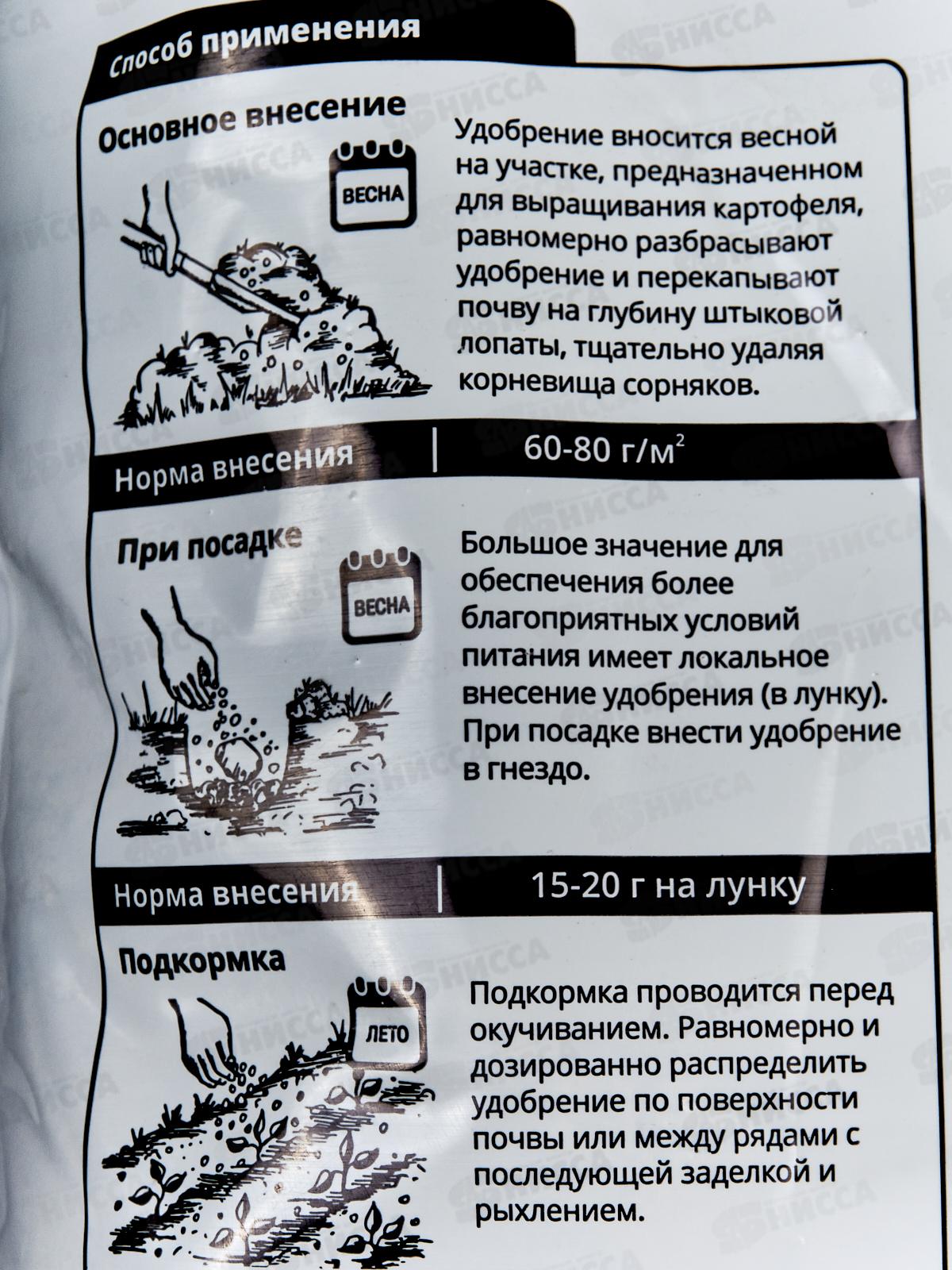 Комплексное органоминеральное удобрение для картофеля, содержащее сбалансированный набор макро- и микроэлементов. Удобрение способствует созреванию полноценных, здоровых клубней с прекрасными вкусовыми качествами и отличными показателями массы и лежкости. Позволяет сократить сроки созревания растений на две недели и обеспечивает увеличение урожая на 35-40%. Защищает от проволочника и неблагоприятных погодных условий.