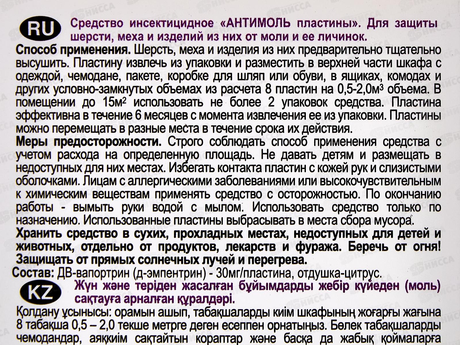 Способ применения: шерсть, меха и изделия из них предварительно тщательно высушить. Пластину извлечь из упаковки и разместить в верхней части шкафа с одеждой, чемодане, пакете, коробке для шляп или обуви, в ящиках, комодах и других условно-замкнутых объемах из расчета 8 пластин на 0,5 - 2,0 м.куб. объема. В помещении до 15 м.кв. использовать не более 2 упаковок средства. Пластина эффективна в течение 6 месяцев с момента извлечения ее из упаковки. Пластины можно перемещать в разные места в течение срока их действия.