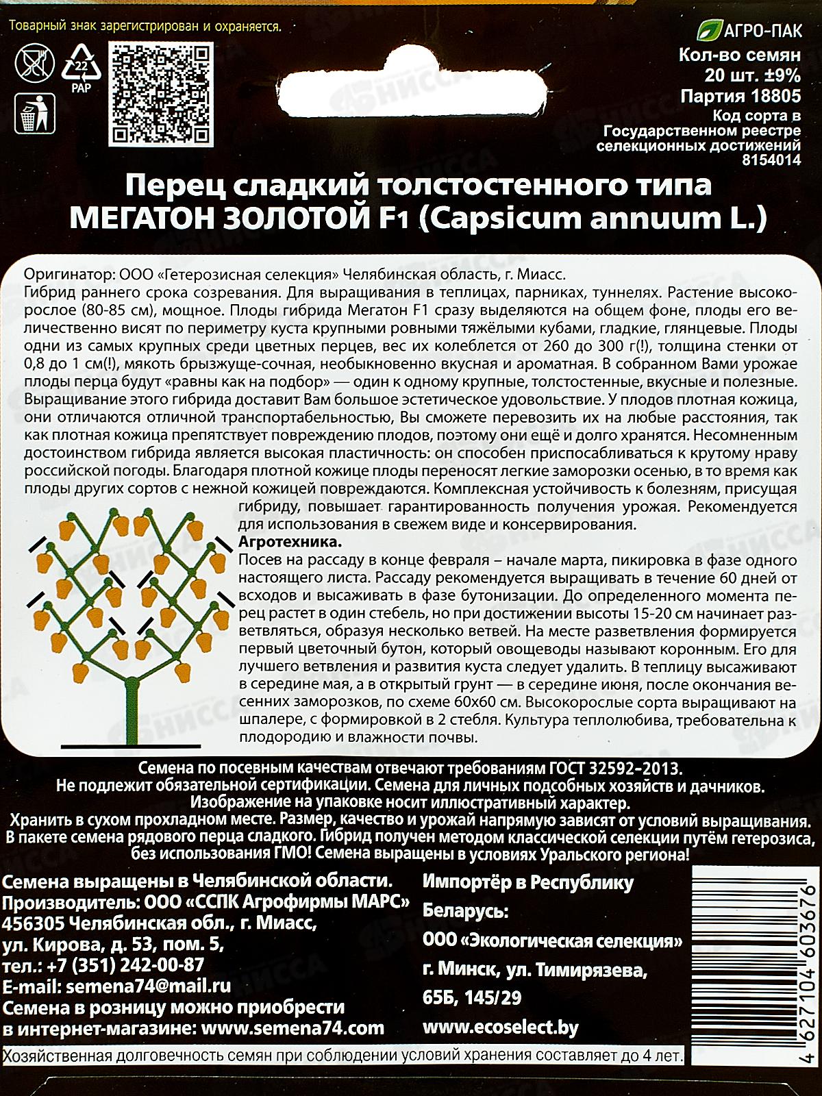 Перец МЕГАТОН ЗОЛОТОЙ F1 - гибрид раннего срока созревания. Для выращивания в теплицах, парниках, туннелях. Растение высокорослое (80-85 см), мощное. Плоды гибрида Мегатон F1 сразу выделяется на общем фоне, плоды его величественно висят по периметру куста крупными ровными тяжёлыми крупными кубами, гладкие, глянцевые. Плоды одни из самых крупных среди цветных перцев, вес их колеблется от 260 до 300 г (!), толщина стенки от 0,8 до 1 см(!), мякоть брызжуще-сочная, необыкновенно вкусная и ароматная. В собранном Вами урожае плоды перца будут "равны как на подбор" – один к одному крупные, толстостенные, вкусные и полезные. Выращивание этого гибрида доставит Вам большое эстетическое удовольствие. У плодов плотная кожица, они отличаются отличной транспортабельностью, Вы сможете перевозить их на любые расстояния, так как плотная кожица препятствует повреждению плодов, поэтому они ещё и долго хранятся. Несомненным достоинством гибрида является высокая пластичность: он способен приспосабливаться к крутому нраву российской погоды. Благодаря плотной кожице, плоды переносят легкие заморозки осенью, в то время как плоды других сортов с нежной кожицей повреждаются. Комплексная устойчивость к болезням, присущая гибриду, повышает гарантированность получения урожая. Рекомендуется для использования в свежем виде и консервирования.