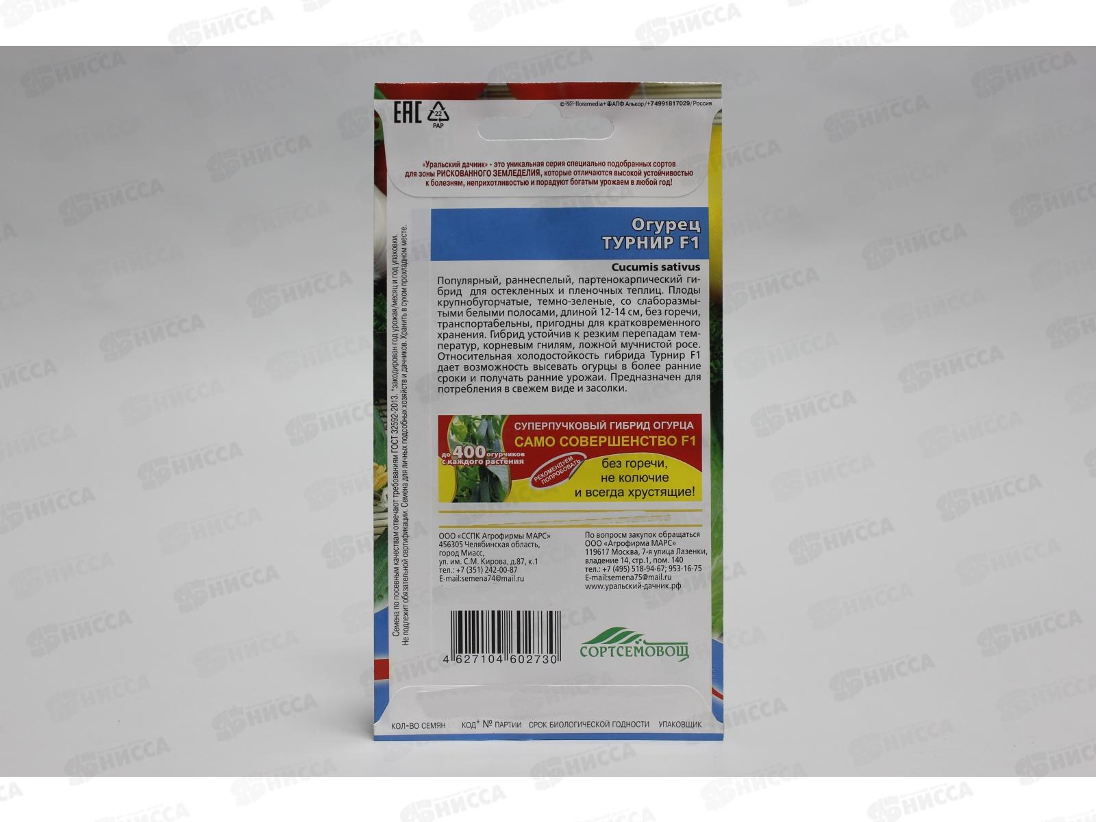 Популярный, раннеспелый, партенокарпический гибрид для остекленных и пленочных теплиц. Плоды крупнобугорчатые, темно-зеленые, со слаборазмытыми белыми полосами, длиной 12-14 см, без горечи, транспортабельны, пригодны для кратковременного хранения. Гибрид устойчив к резким перепадам температур, корневым гнилям, ложной мучнистой росе. Относительная холодостойкость гибрида Турнир F1 дает возможность высевать огурцы в более ранние сроки и получать ранние урожаи. Предназначен для потребления в свежем виде и засолки.