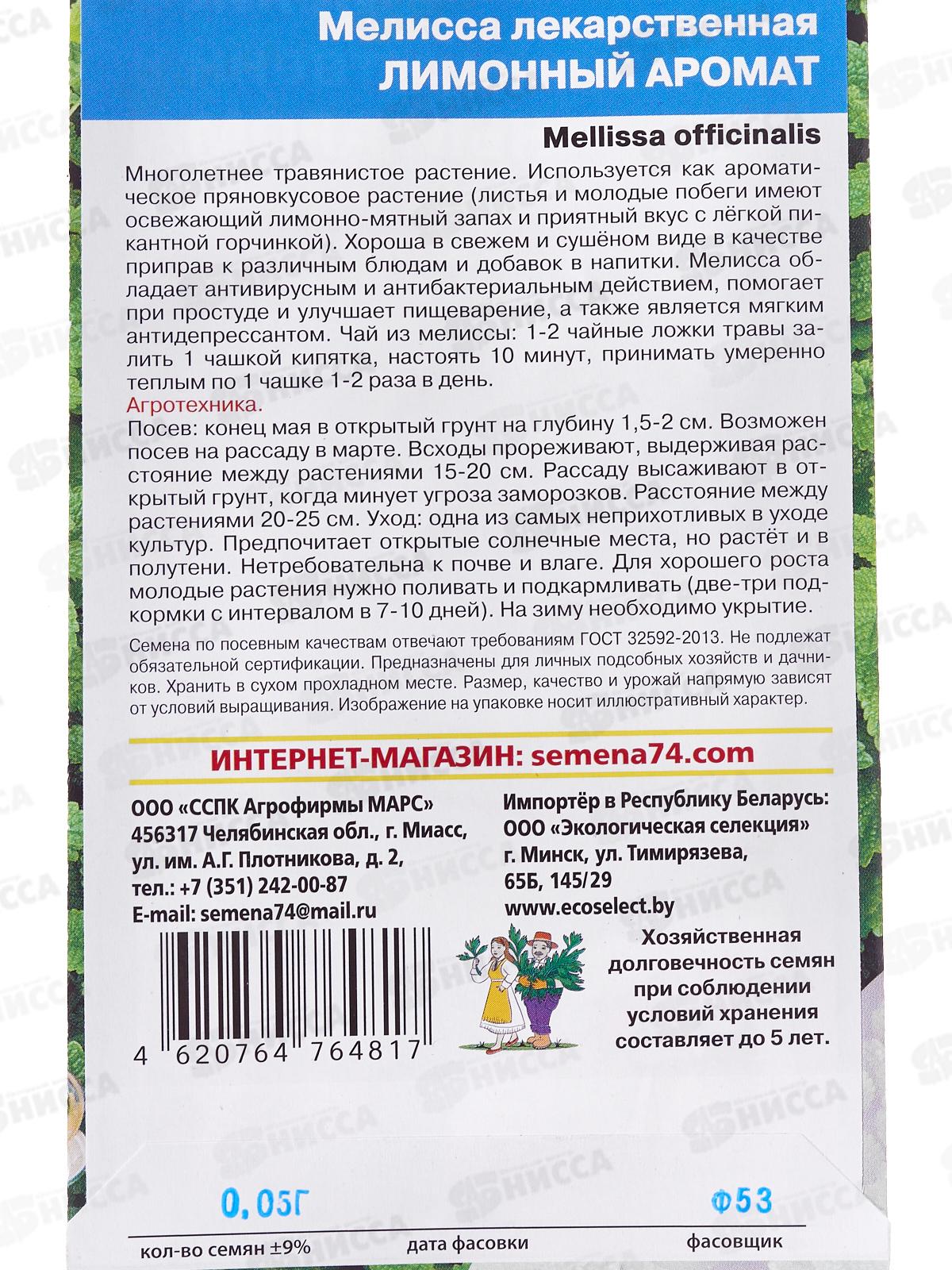 Многолетнее травянистое растение. Используется как ароматическое пряновкусовое растение (листья и молодые побеги имеют освежающий лимонно-мятный запах и приятный вкус с лёгкой пикантной горчинкой). Хороша в свежем и сушёном виде в качестве приправ к различным блюдам и добавок в напитки. Мелисса обладает антивирусным и антибактериальным действием, помогает при простуде и улучшает пищеварение, а также является мягким антидепрессантом. Чай из мелиссы: 1-2 чайные ложки травы залить 1 чашкой кипятка, настоять 10 минут, принимать умеренно тёплым по 1 чашке 1-2 раза в день. Посев: конец мая в открытый грунт на глубину 1,5-2 см. Возможен посев на рассаду в марте. Всходы прореживают, выдерживая расстояние между растениями 15-20 см. Рассаду высаживают в открытый грунт, когда минует угроза заморозков. Расстояние между растениями 20-25 см. Уход: одна из самых неприхотливых в уходе культур. Предпочитает открытые солнечные места, но растёт и в полутени. Нетребовательна к почве и влаге. Для хорошего роста молодые растения нужно поливать и подкармливать (две-три подкормки с интервалом в 7-10 дней). На зиму необходимо укрытие.