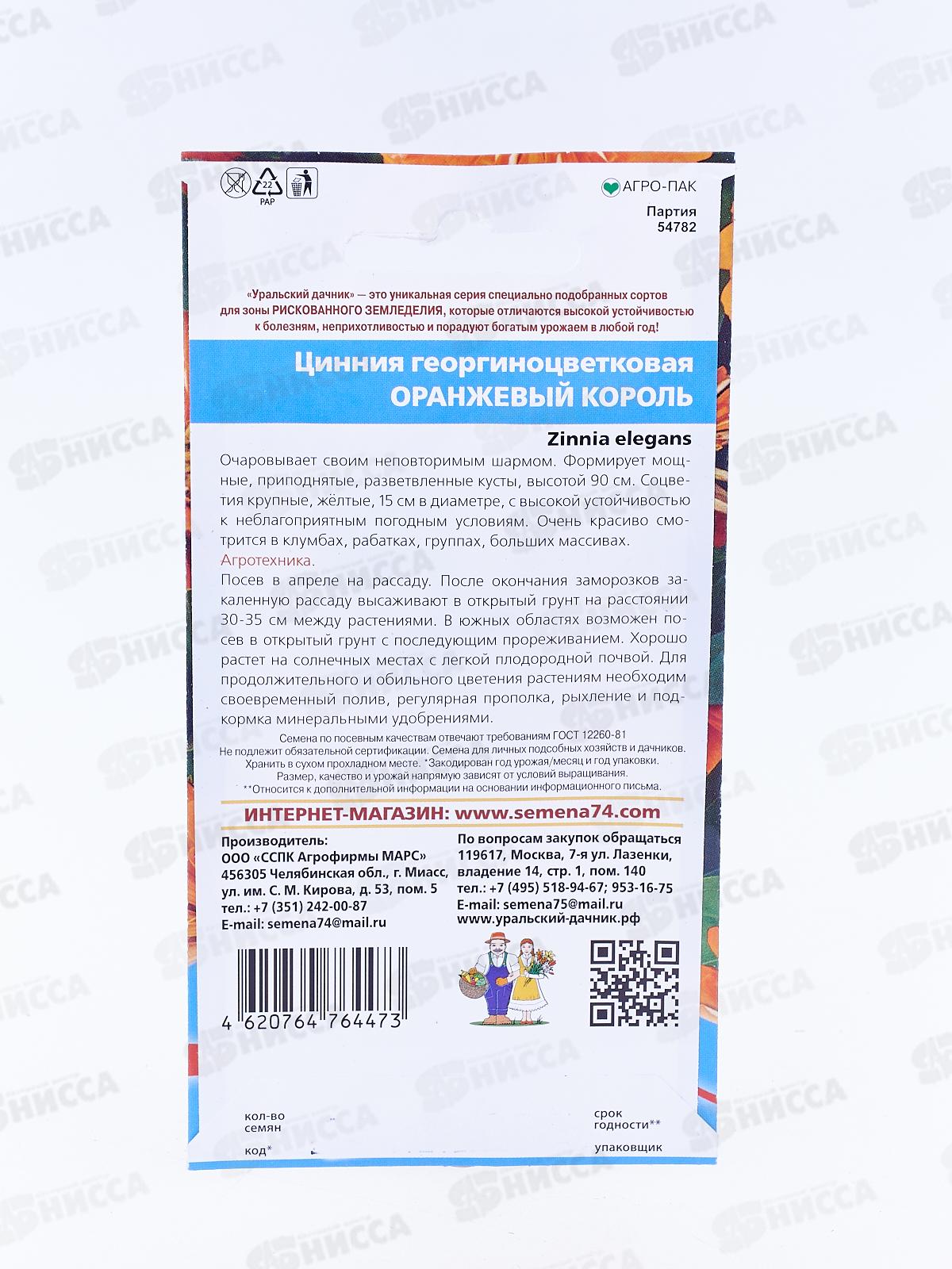 Высота 90 см. Крупные махровые соцветия, до 15 см в диаметре, имеют яркую, насыщенно-оранжевую окраску. Цветёт обильно и продолжительно. Используют для украшения клумб и рабаток. Посев в марте - апреле на рассаду. Через 3-4 недели после всходов сеянцы пикируют. В открытый грунт рассаду высаживают, когда минует угроза заморозков. Расстояние между растениями 40 см. Предпочитает солнечные, защищённые от ветров, тёплые участки с дренированной, нейтральной, богатой гумусом и минеральными элементами почвой. Цветение с июля до заморозков. Цинния хорошо сочетается с ноготками, бархатцами, мелкоцветковыми хризантемами, вербеной.