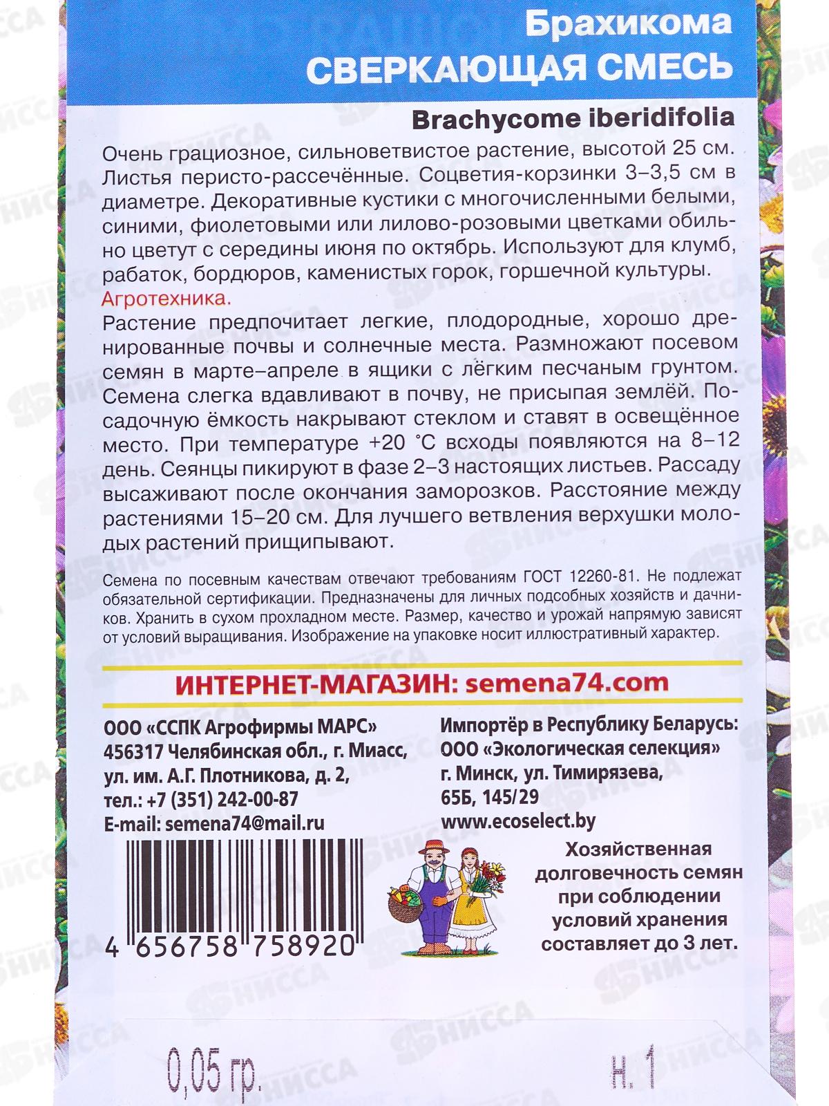Прелестное сильно разветвленное однолетнее растение брахикомы легко выращивать, поскольку ему не требуется особого ухода. Цветет в течение трех летних месяцев изящными листьями и звездчатыми соцветиями-корзинками диаметром 3-3,5 см. Высота 25-30 см. Данная смесь включает в себя цветы разнообразных окрасок. Брахикому используют для украшения клумб, рабаток, бордюров, каменистых горок, горшечной культуры. Предпочитает плодородные, хорошо дренированные почвы и солнечные места. Посев на рассаду проводят в марте в ящики с легким песчаным грунтом. Семена слегка вдавливают в почву, не присыпая землей. Посадочную емкость накрывают стеклом и ставят в освещенное место. При температуре +20 С всходы появляются на 8-12 день. Сеянцы пикируют в фазе 2-3 настоящих листьев. Для лучшего ветвления верхушки молодых растений прищипывают. Рассаду высаживают на постоянное место проводят после окончания заморозков, по схеме 15х20 см.