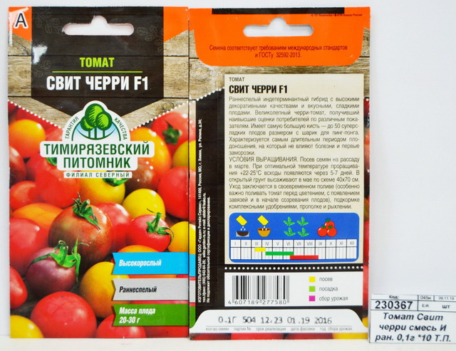 Раннеспелый индетерминантный гибрид с высокими декоративными качествами и вкусными, сладкими плодами. На кисти располагается до 50 плодов размером с шарик для пинг-понга. Преимущества: Скороспелый. Длительное плодоношение и отличные вкусовые качества. Применяется для выращивания в открытом грунте и под пленочными укрытиями. Род: паслён. Жизненный цикл: однолетник. Сорт: раннеспелый. Плод: 20 - 30 г. Высота: 1,5 - 2 м. Посев: март - апрель. Посадка: апрель - июнь. Сбор урожая: июнь - сентябрь.