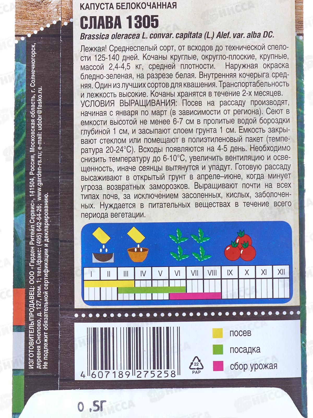 Капуста белокочанная Слава 1305 средняя 0,5 грамм *10 Т.П. +