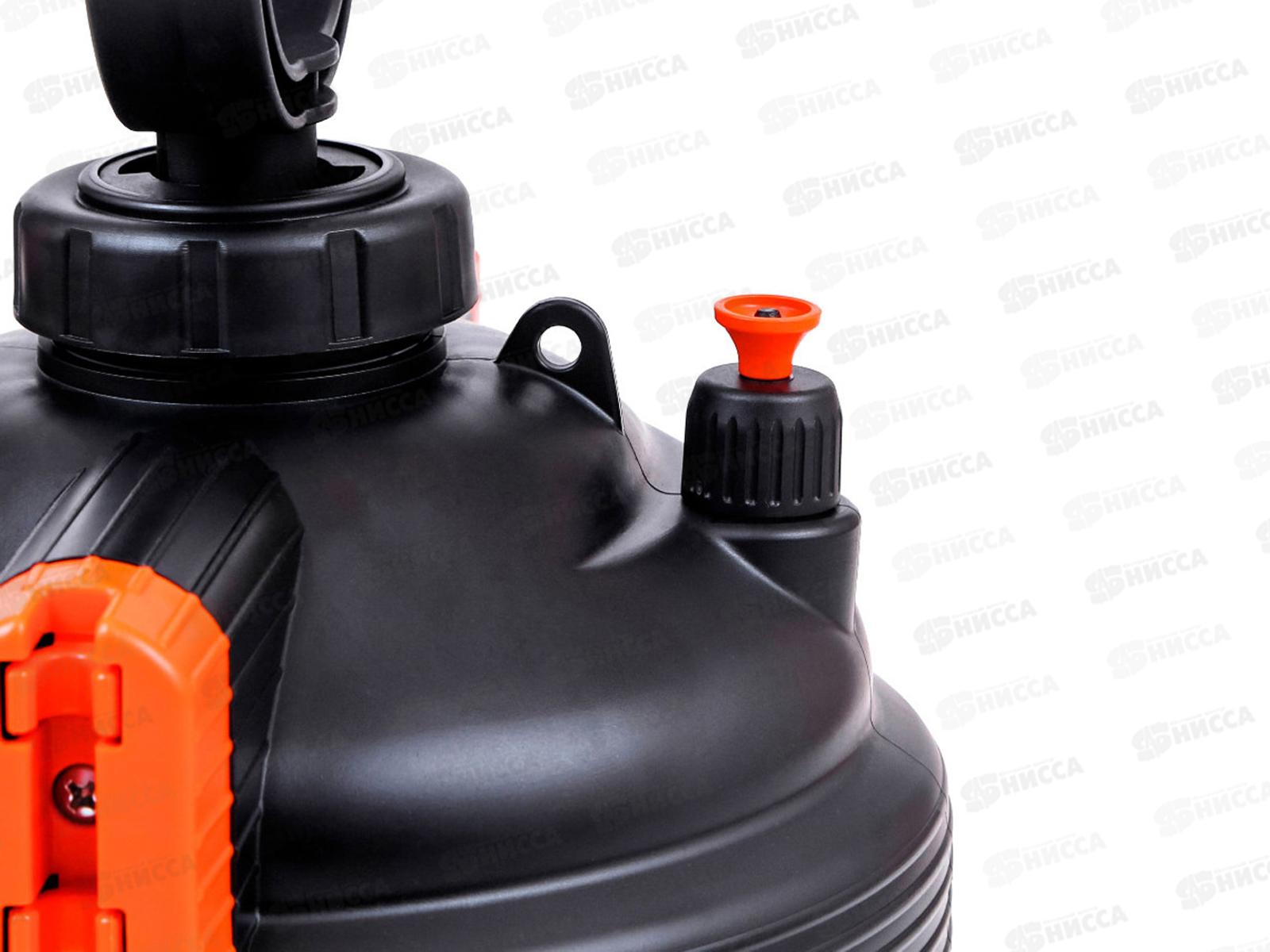Бак со съёмной крышкой, поэтому заливка рабочей жидкости не составит труда. Мерная шкала внутри бака показывает остаток содержимого. Предохранительный клапан срабатывает при избыточном давлении, что обеспечивает безопасность в процессе эксплуатации опрыскивателя.