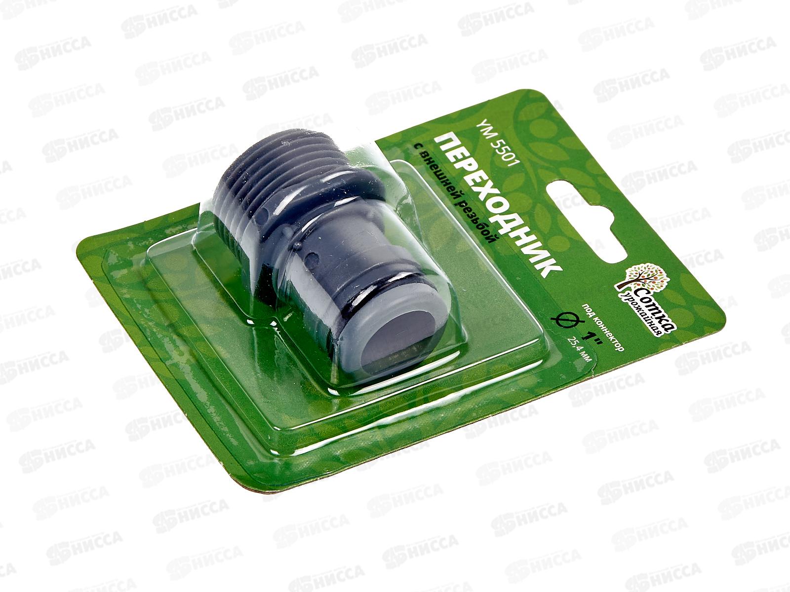 Линейка комплектующих для полива растений "Урожайная сотка" - это качественная продукция со стильным дизайном. Переходник на трубу с внешней резьбой 'Урожайная сотка' (YM5501), предназначен для соединения шланга с помощью коннектора 1' с трубой 1. Переходник будет незаменим на любом дачном участке. Тип крепления - под коннектор увеличенного размера - 1'.