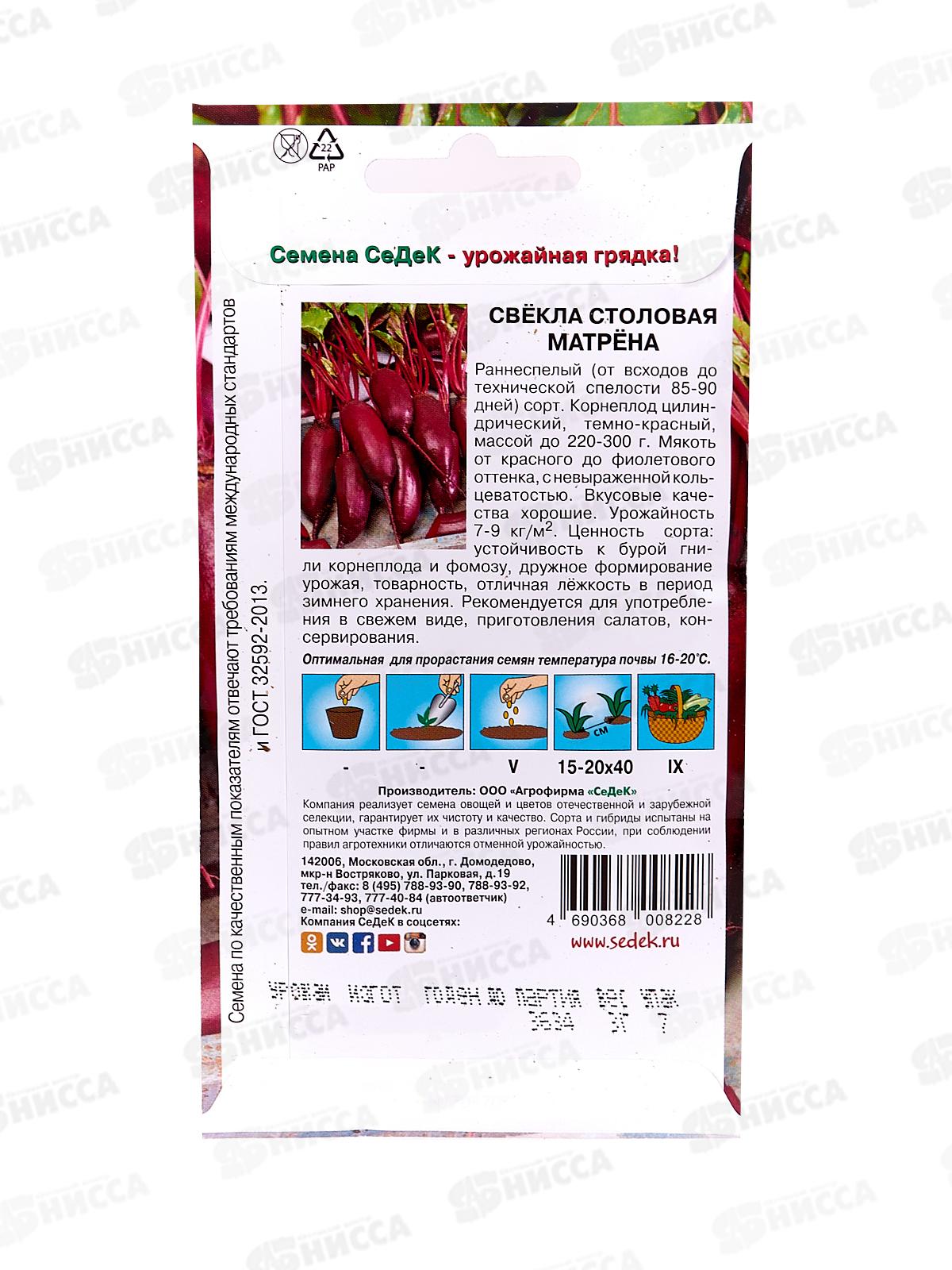 Раннеспелый (от всходов до технической спелости 85-90 дней) сорт. Корнеплод цилиндрический, темно-красный, массой до 220-300 г. Мякоть от красного до фиолетового оттенка, с невыраженной кольцеватостью. Вкусовые качества хорошие. Урожайность 7-9 кг/м?. Ценность сорта: устойчивость к бурой гнили корнеплода и фомозу, дружное формирование урожая, товарность, отличная лежкость в период зимнего хранения. Рекомендуется для употребления в свежем виде, приготовления салатов, консервирования.