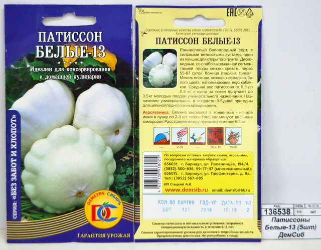 Раннеспелый белоплодный сорт, с сильными ветвистыми кустами, один из лучших для открытого грунта. Дисковидные, со слабо выраженной сегментацией плоды можно срезать через 55–67 суток. Кожица гладкая, тонкая. Мякоть плотная, нежная, несладкая, белого цвета, напоминающая вкус кабачков. Средний вес патиссона от 0,3 до 0,5 кг, с куста за сезон получают до 3,5 кг молодых плодов универсального назначения. Назначение универсальное, в возрасте 3-5 дней пригодны для цельноплодно-го консервирования.