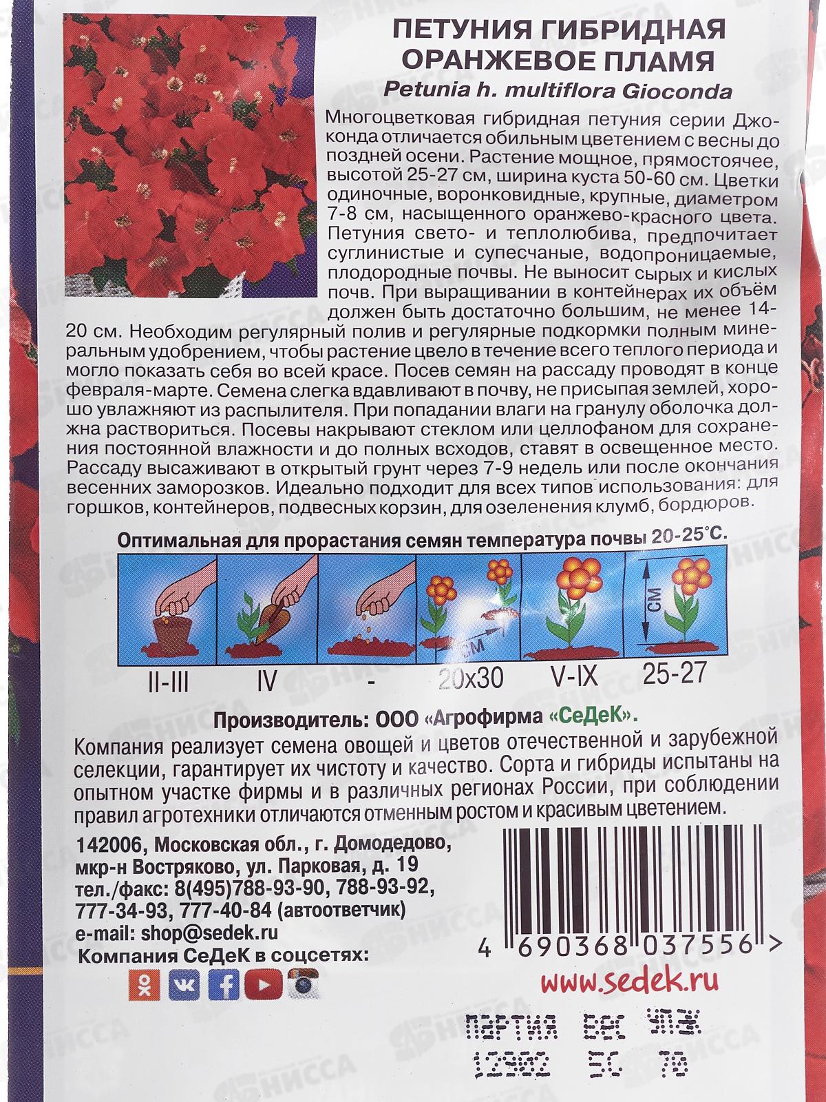 Многоцветковая гибридная петуния серии Джоконда отличается обильным цветением с весны до поздней осени. Растение мощное, прямостоячее, высотой 25-27 см, ширина куста 50-60 см. Цветки одиночные, воронковидные, крупные, диаметром 7-8 см, насыщенного оранжево-красного цвета. Петуния свето- и теплолюбива, предпочитает суглинистые и супесчаные водопроницаемые плодородные почвы. Не выносит сырых и кислых почв. При выращивании в контейнерах их объём должен быть достаточно большим, не менее 14-20 см. Необходим регулярный полив и регулярные подкормки полным минеральным удобрением, чтобы растение цвело в течение всего теплого периода и могло показать себя во всей красе. Посев семян на рассаду проводят в конце февраля-марте. Семена слегка вдавливают в почву, не присыпая землей, хорошо увлажняют из распылителя. При попадании влаги на гранулу оболочка должна раствориться. Посевы накрывают стеклом или целлофаном для сохранения постоянной влажности и до полных всходов, ставят в освещенное место. Рассаду высаживают в открытый грунт через 7-9 недель или после окончания весенних заморозков. Идеально подходит для всех типов использования: для горшков, контейнеров, подвесных корзин, для озеленения клумб, бордюров.