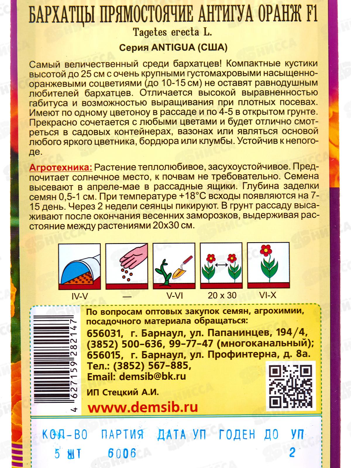 Бархатцы Антигуа оранж махровые прямостоячие (5шт) ДемСиб