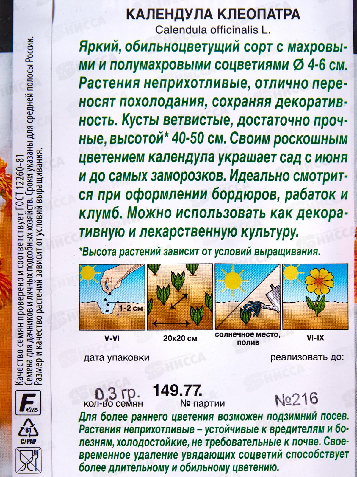 Кусты ветвистые, достаточно прочные, высотой 40-50 см. Своим роскошным цветением календула украшает сад с июня и до самых заморозков. Идеально смотрится при оформлении бордюров, рабаток и клумб. Можно использовать как декоративную и лекарственную культуру. Высота растений зависит от условий выращивания. Для более раннего цветения возможен подзимний посев. Растения неприхотливые – устойчивые к вредителям и болезням, холодостойкие, не требовательные к почве. Своевременное удаление увядающих соцветий способствует более длительному и обильному цветению.