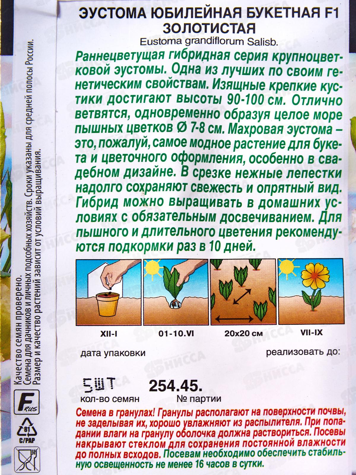 Изящные крепкие кустики достигают высоты 90-100 см. Отлично ветвятся, одновременно образуя целое море пышных цветков 7-8 см. Махровая эустома – то, пожалуй, самое модное растение для букета и цветочного оформления, особенно в свадебном дизайне. В срезке нежные лепестки надолго сохраняют свежесть и опрятный вид. Гибрид можно выращивать в домашних условиях с обязательным досвечиванием. Для пышного и длительного цветения рекомендуются подкормки раз в 10 дней. Семена в гранулах! Гранулы располагают на поверхности почвы, не заделывая их, хорошо увлажняют из распылителя. При попадании влаги на гранулу оболочка должна раствориться. Посевы накрывают стеклом для сохранения постоянной влажности до полных всходов. Посевам необходимо обеспечить стабильную освещенность не менее 16 часов в сутки.