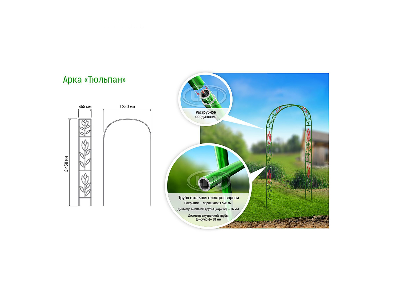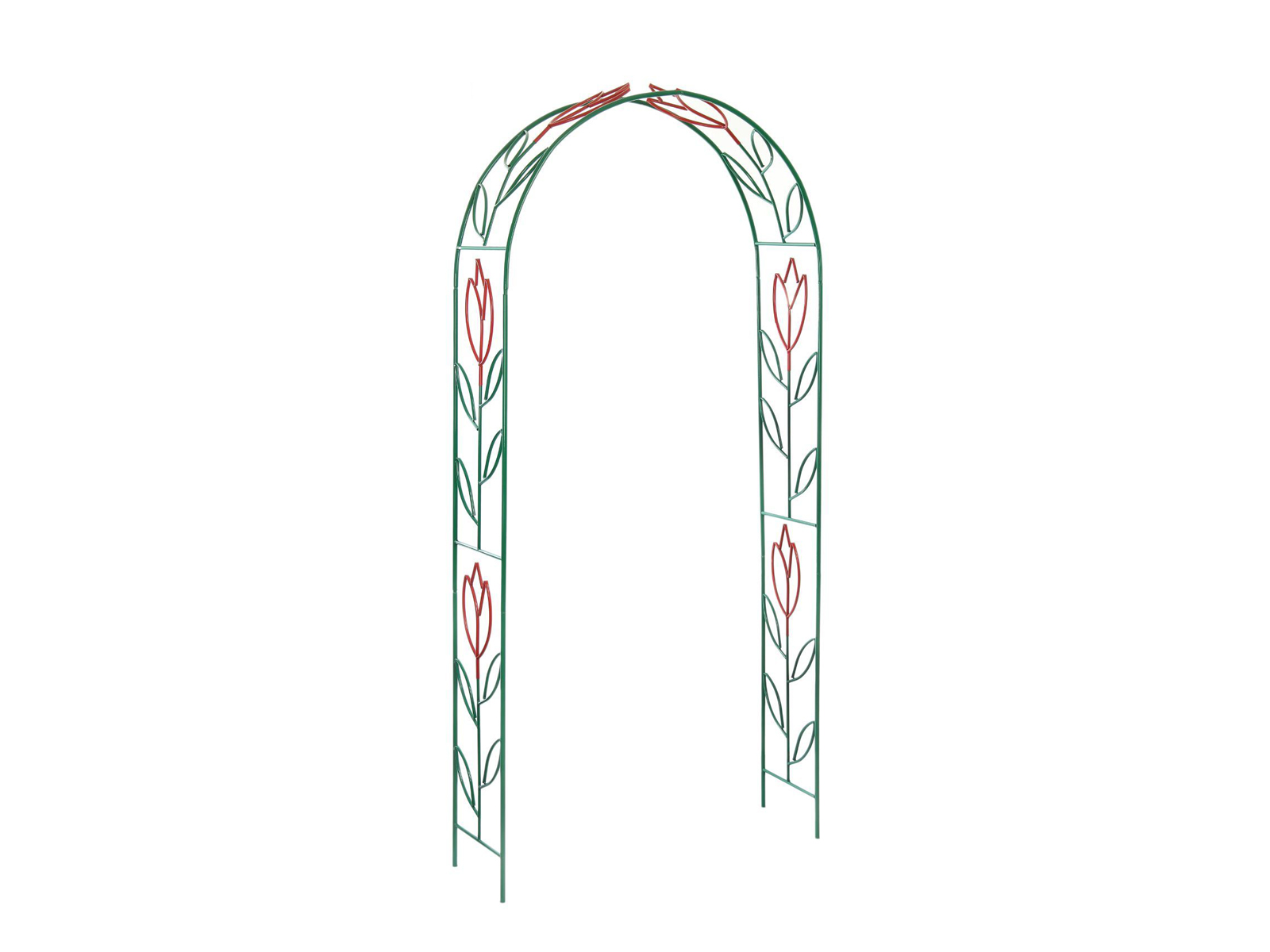 Ажурная садовая арка "Тюльпан" сама по себе отлично украсит ваш сад. Увитая зеленью и цветами, она сделает ваш участок неповторимым. Её применяют для поддержки стеблей вьющихся растений: лимонника, клематиса, декоративного винограда. Арка покроется слоем зелени, и узорный каркас превратится в цветочный проём. Лёгкая конструкция из металла выдерживает вес растений, устойчива к воздействию осадков и температуры. Под аркой не нужен фундамент, вы можете разбирать её и переносить по участку.