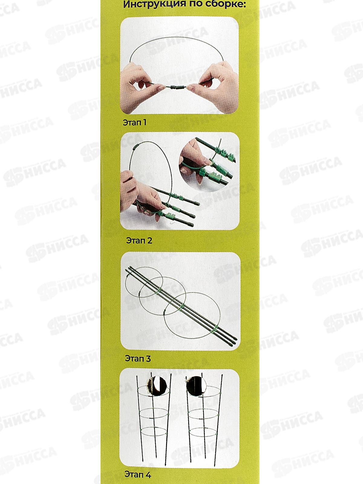 Характеристики: Бренд: INBLOOM Артикул: 154-004 Тип товара: Опора для растений Конструкция: 3 кольца Высота: 75 см Диаметр колец: 22, 26, 28 см Диаметр опор: 7 мм Материал: пластик Цвет: зеленый