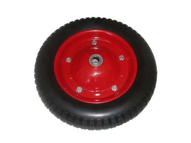 Пневматическое колесо для садово-огородной тачки 3.00-8, воздушное, с шариковым подшипником. Основание колеса выполнено из металла. В ступице установлен шариковый подшипник. Диаметр оси - 20 мм.