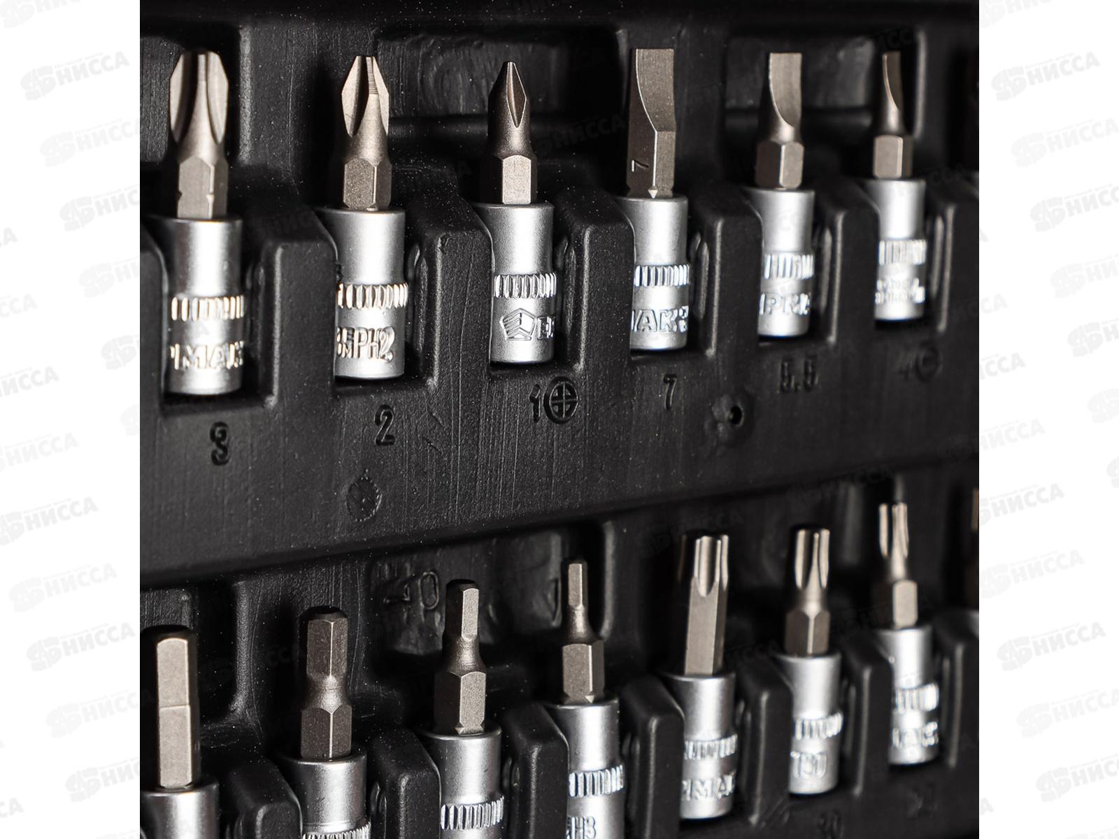 Состав: головки торцевые 1/4" 4, 4,5, 5, 5,5, 6, 7, 8, 9, 10, 11, 12, 13, 14 мм - 13 шт, отверточные торцевые головки 1/4" T10, Т15, Т20, Т25, Т30, Т40, РН1, РН2, РН3, Р1, Р2, Р3, НЕХ 3, 4, 5, 6, 7, 8 мм, Slotted 4, 5,5, 7 мм - 21 шт, ключи шестиганные 1,5, 2, 2,5 мм - 3 шт, карданный шарнир 1/4", ключ трещоточный с быстрым сбросом 1/4", отвертка с присоеденительным квадратом 1/4", удлинитель 50 мм 1/4", удлинитель 100 мм 1/4", гибкий удлинитель 150 мм 1/4", вороток Т-образный 1/4", переходник 1/4"