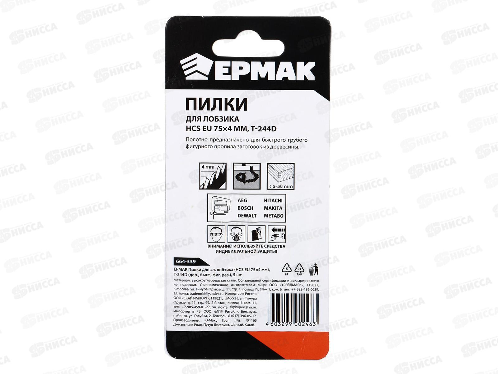 Пилки для электрических лобзиков Ермак, Т-244D. Сменный инструмент, используемый в электрическом лобзике. Служит для быстрого вырезания отверстий в искусственных или деревянных плитах, дверях, окнах.