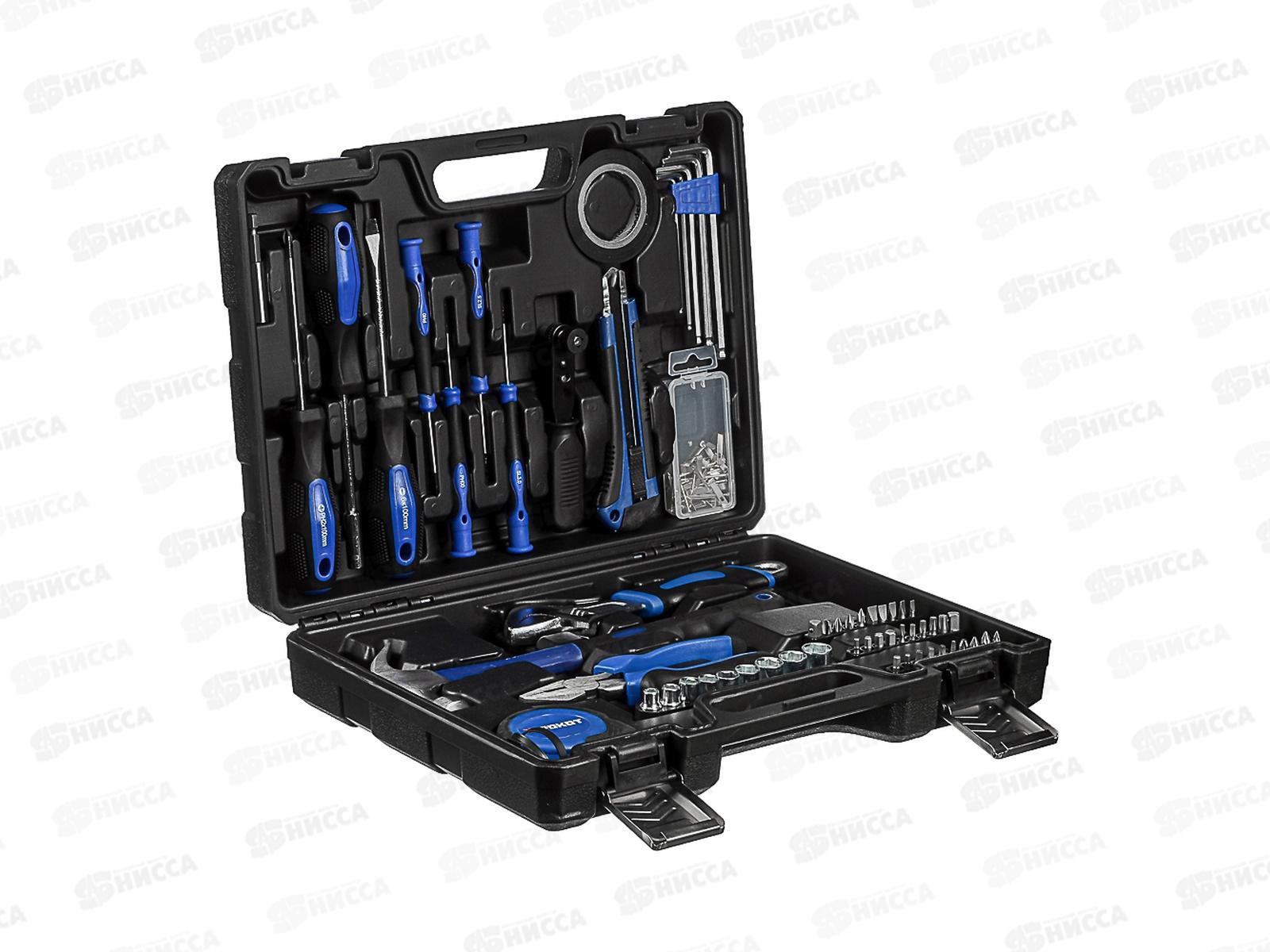 Набор инструмента из 100 предметов РОКОТ – это незаменимый комплект для авто, дома, гаража и небольшого автосервиса. Включает все необходимое для мелкого ремонта, проведения монтажных работ, а также для обслуживания техники и транспортных средств. В состав набора входят: битодержатель, имбусовые ключи, изолента, набор крепежа, трещотка, разводной ключ, длинногубцы, 28 бит, 9 торцевых головок, рулетка на 3 метра, молоток, отвертки SL6 и PH2, а также отвертки для точечных работ. Все инструменты выполнены из высококачественной прочной закаленной углеродистой стали, рассчитаны на длительный срок службы, устойчивы к износу, деформации и коррозии. Удобный пластиковый кейс-футляр обеспечит комфортное и компактное хранение, а также прекрасно подходит для транспортировки.