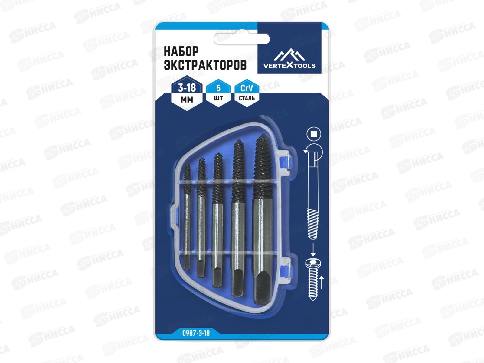 Набор экстракторов М3-М18 мм 0987-3-18 VERTEXTOOLS - качественный инструмент для удаления сломанного крепежа из корпуса деталей. В комплекте 5 экстракторов типовых размеров для винтов с резьбой М3-6, М6-8, М8-11, М11-14, М14-18. Они изготовлены из хромованадиевой стали высокого качества, благодаря чему отличаются прочностью и долгим сроком службы. Используется для болтов и шпилек с правой резьбой.