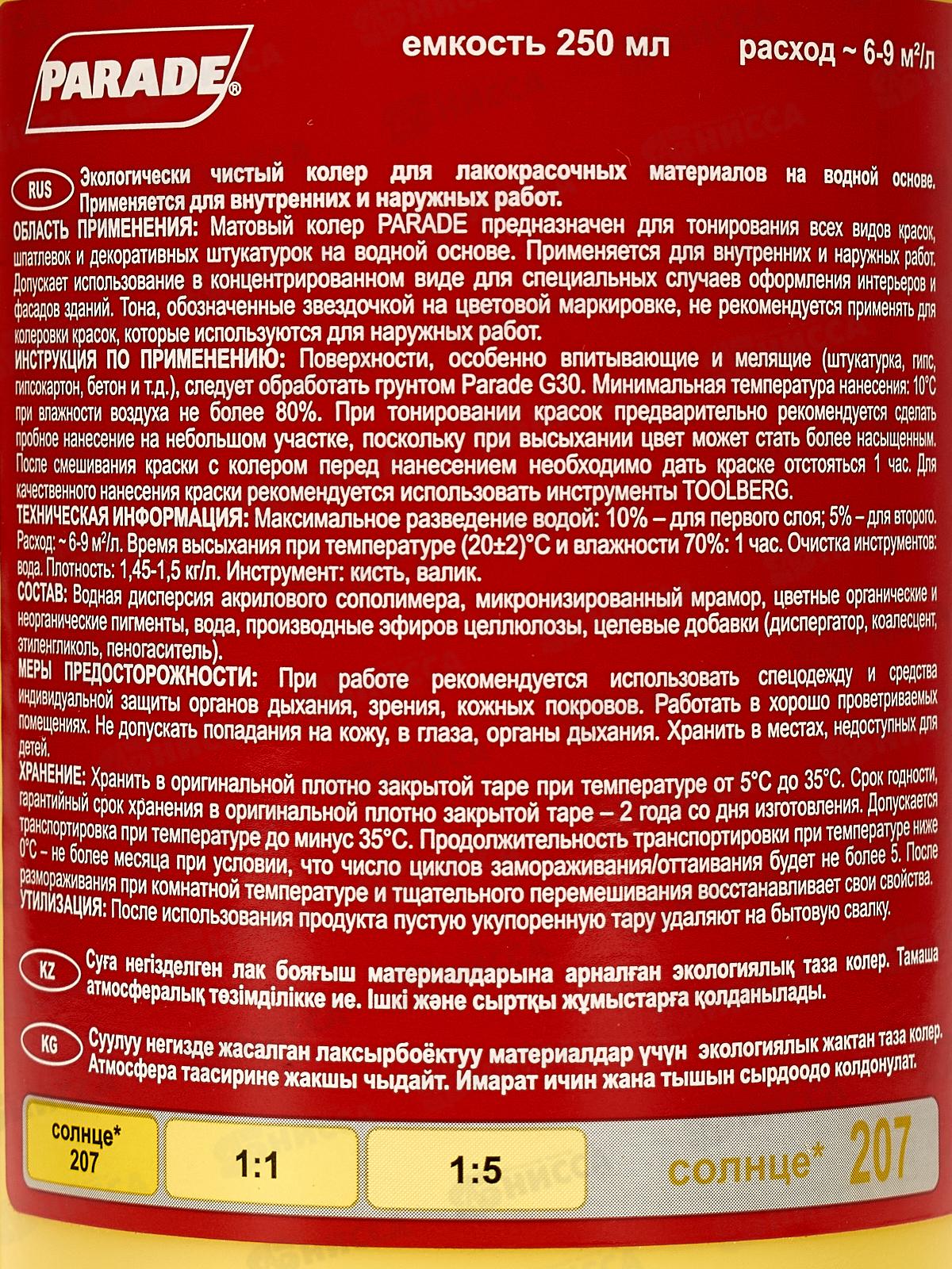 Экологически чистый колер для лакокрасочных материалов на водной основе. Для внутренних и наружных работ. Предназначен для тонирования всех видов красок, шпатлевок и декоративных штукатурок на водной основе. Допускает использование в концентрированном виде для специальных случаев оформления интерьеров и фасадов зданий. Тона, обозначенные звездочкой на цветовой маркировке, не рекомендуется применять для колеровки красок, которые используются для наружных работ. Обладает отличной атмосферостойкостью, светостойкостью, прочностью к истиранию. При тонировании красок предварительно рекомендуется сделать пробное нанесение на небольшом участке, поскольку при высыхании цвет может стать более насыщенным. Для колеровки лакокрасочных материалов на водной основе. Отличная атмосферостойкость и светостойкость. Высокая стойкость к истиранию.
