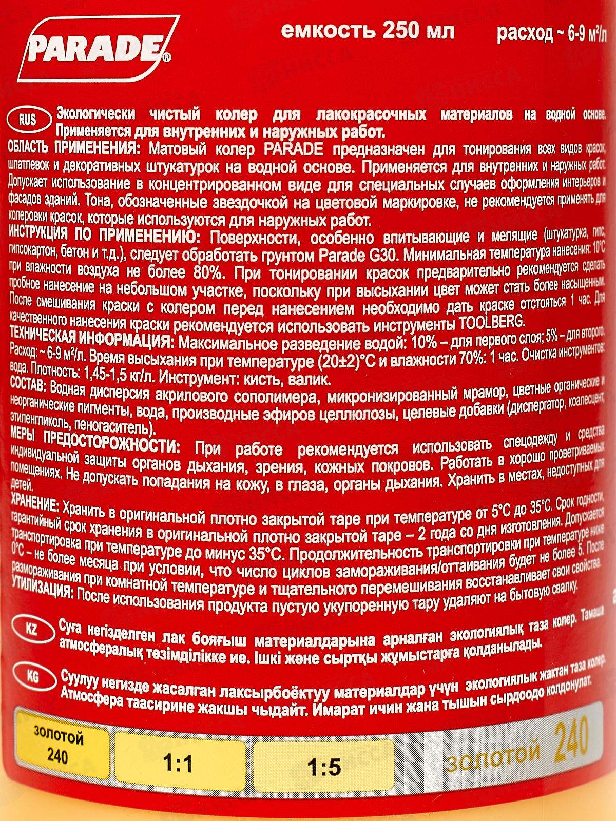 Экологически чистый колер для лакокрасочных материалов на водной основе. Для внутренних и наружных работ. Предназначен для тонирования всех видов красок, шпатлевок и декоративных штукатурок на водной основе. Допускает использование в концентрированном виде для специальных случаев оформления интерьеров и фасадов зданий. Тона, обозначенные звездочкой на цветовой маркировке, не рекомендуется применять для колеровки красок, которые используются для наружных работ. Обладает отличной атмосферостойкостью, светостойкостью, прочностью к истиранию При тонировании красок предварительно рекомендуется сделать пробное нанесение на небольшом участке, поскольку при высыхании цвет может стать более насыщенным.