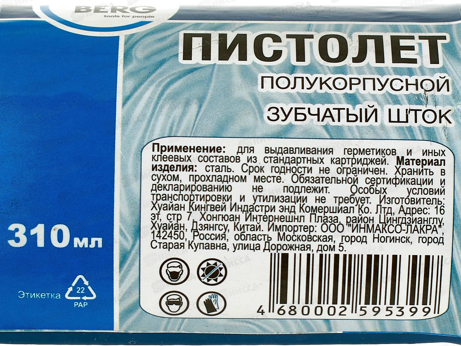 Пистолет для герметика TOOLBERG 310мл полукорпусной с зубчатым штоком, 1901004 *40