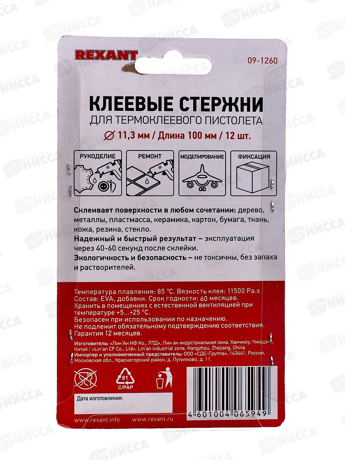 Стержни клеевые для клеевого пистолета 11.3мм, длина 100мм, прозрачные - светящиеся, 12шт в блистере, Rexant, 09-1260 *100