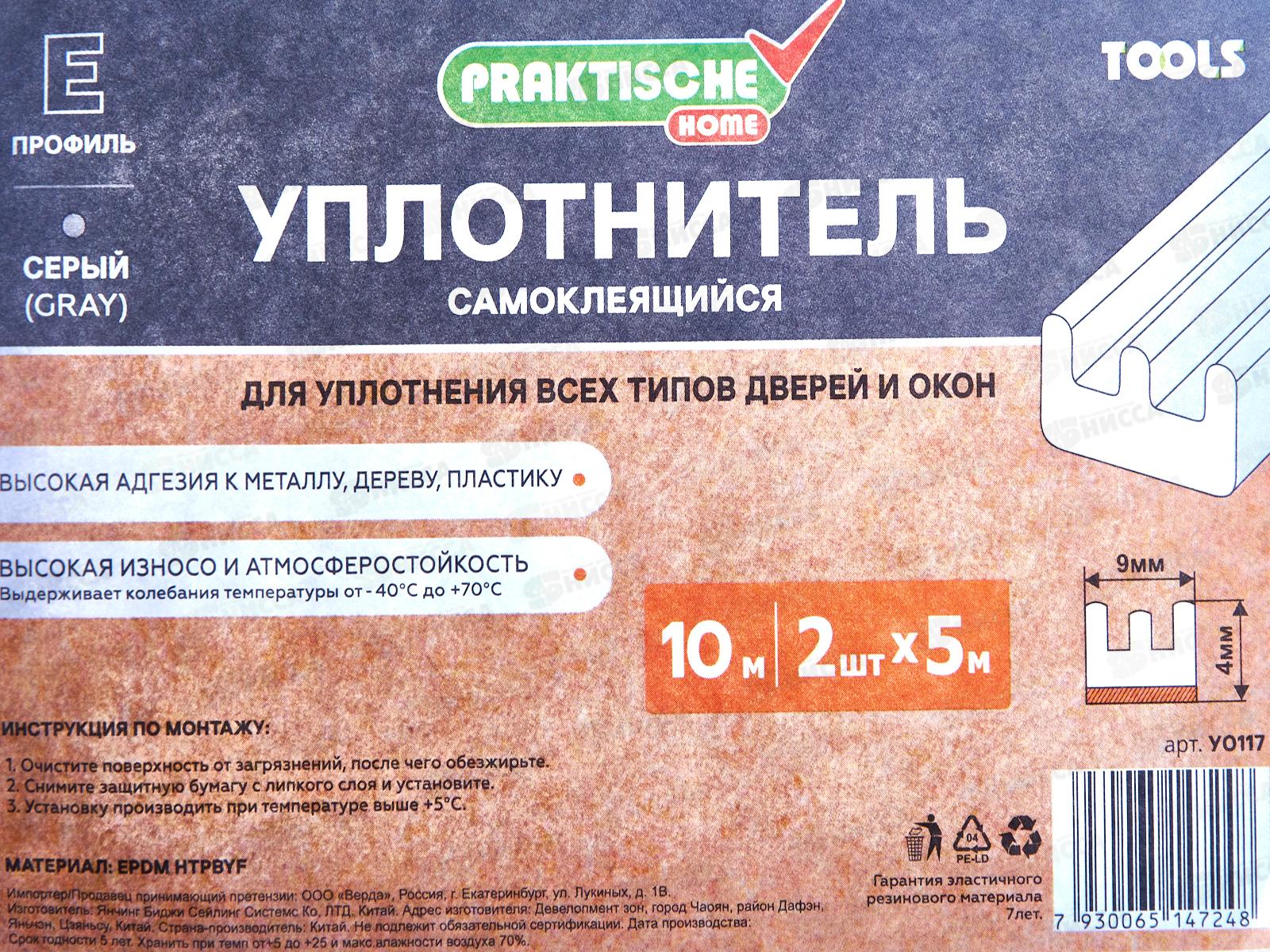 Уплотнитель самоклеящийся PRAKTISCHE 9х4мм Е- 10м (сер) У0117