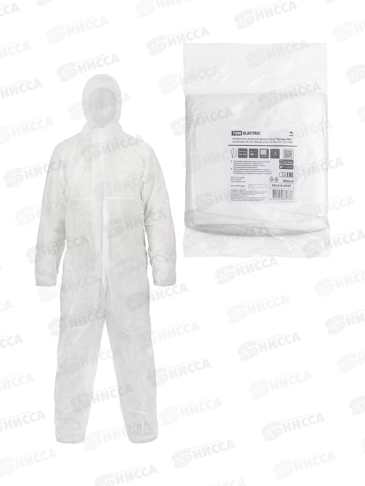 Комбинезон защитный одноразовый "Каспер Р40", на молнии, 40 г/м2, белый, разм. 56-58/170-176, 0323 *40