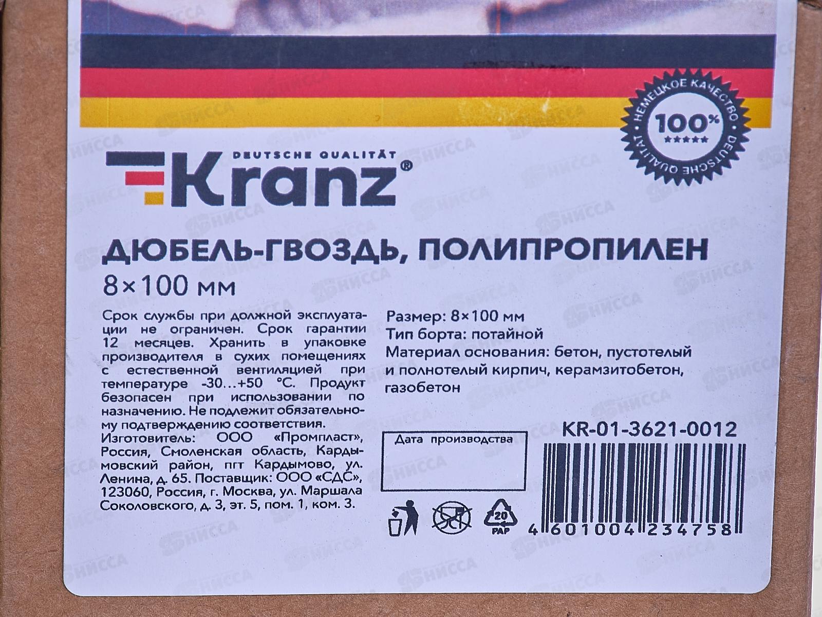 Дюбель-гвоздь потай 8*100мм (100шт) Kranz, KR-01-3621-0012