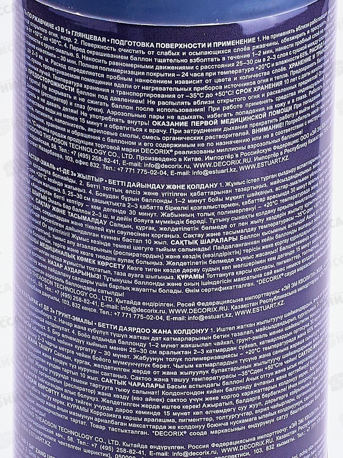 Высококачественная грунт-эмаль по ржавчине DECORIX предназначена для защитно-декоративного окрашивания заржавевших или подверженных коррозии поверхностей из сплавов чёрных металлов при бытовом применении, декоративно-оформительских работах, строительстве и ремонте. Предназначена для окрашивания: древесины, пластика, металла, бетона, кирпича, керамики, стекла, картона и минеральных поверхностей. Сочетает в себе свойства нейтрализатора коррозии, грунтовки и защитно-декоративной эмали («3 в 1»), что позволяет сократить время на подготовку поверхности перед окрашиванием. Применяется для ремонтного окрашивания металлических изделий, инструментов и других видов работ. Аэрозольная грунт-эмаль по ржавчине удобна для окрашивания не больших поверхностей и труднодоступных мест. Также подходит для поверхностей из древесины, бетона, камня, стекла, керамики и некоторых видов пластмасс. Грунт-эмаль образует гладкое глянцевое покрытие, устойчивое к выцветанию.