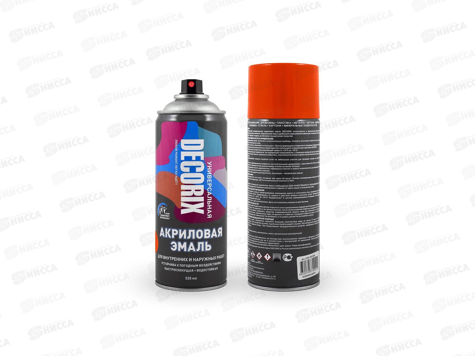 Высококачественная универсальная акриловая глянцевая эмаль DECORIX используется в декоративно-оформительских работах, строительстве и ремонте. Предназначена для окрашивания: древесины, пластика, металла, бетона, кирпича, керамики, стекла, картона, минеральных поверхностей. Аэрозольная эмаль удобна для окрашивания небольших поверхностей и труднодоступных мест. Образует гладкое, устойчивое к выцветанию покрытие.
