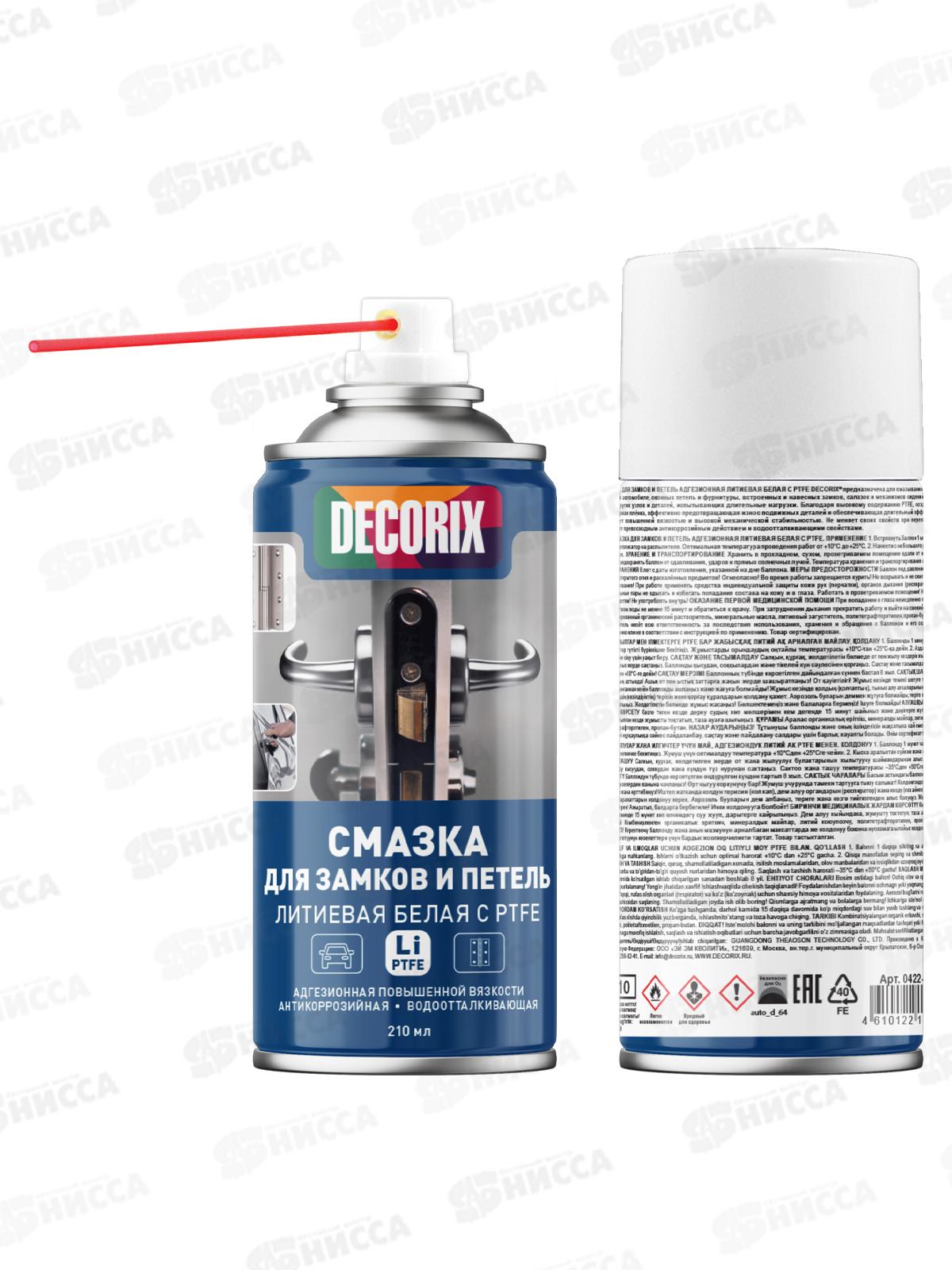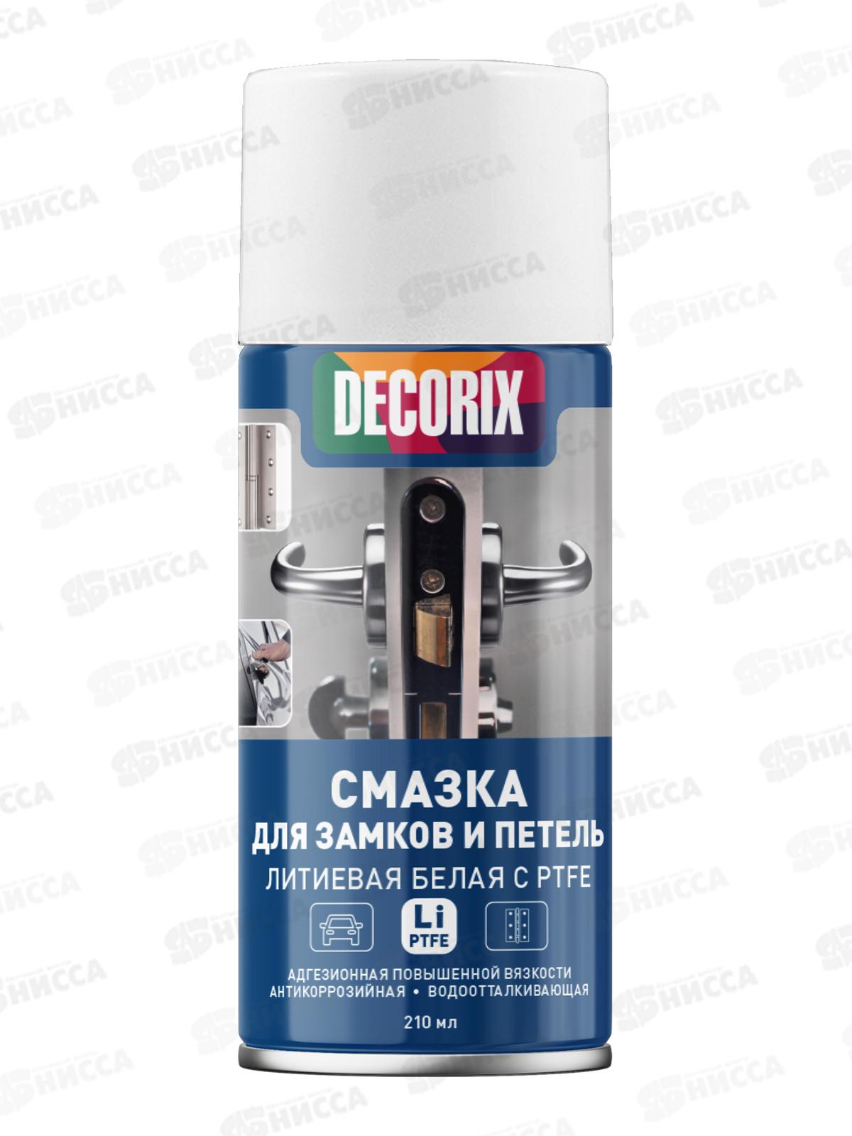 Основа смазки: минеральные масла, литиевый загуститель, комбинированный органический растворитель. СМАЗКА ДЛЯ ЗАМКОВ И ПЕТЕЛЬ АДГЕЗИОННАЯ ЛИТИЕВАЯ БЕЛАЯ C PTFE DECORIX предназначена для смазывания дверных петель в доме и автомобиле, оконных петель и фурнитуры, встроенных и навесных замков, салазок и механизмов сидений автомобилей, а также других узлов и деталей, испытывающих длительные нагрузки.