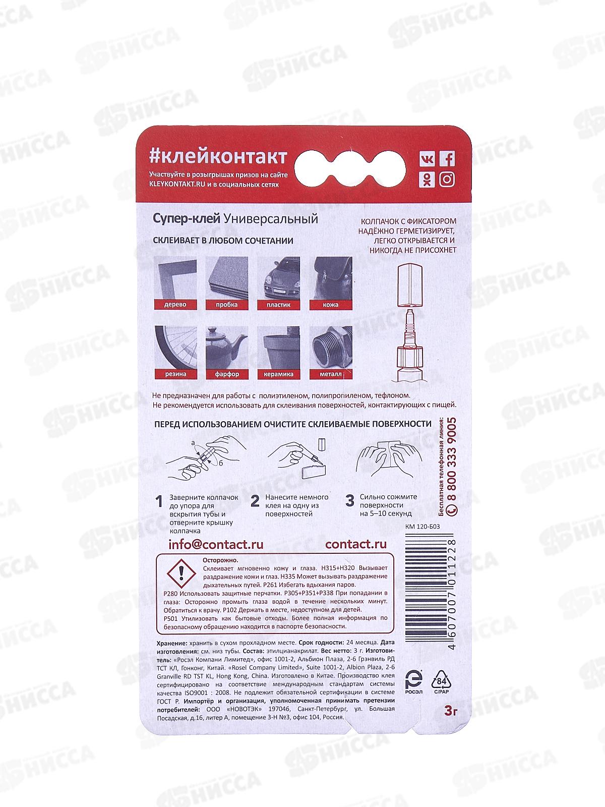 Клей КОНТАКТ моментальный 3г на блитере *10/120