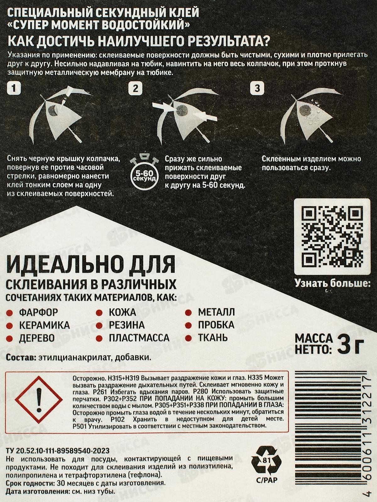 Клей МОМЕНТ-СУПЕР 3г водостойкий, блист., 1683233 *10/120