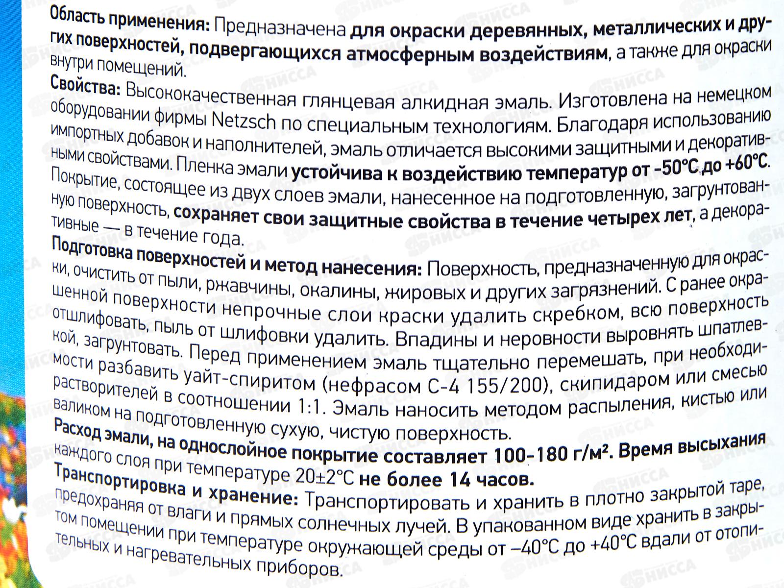 Атмосферостойкая, устойчива к изменению температуры от –50°С до +60 С. Обладает хорошей укрывистостью и сцеплением с поверхностью (адгезией). Предназначена для окраски деревянных, металлических и других поверхностей, подвергающихся атмосферным воздействиям, и для окраски внутри помещений (оконные рамы, двери, кирпичные и бетонные поверхности, ДВП, ДСП).