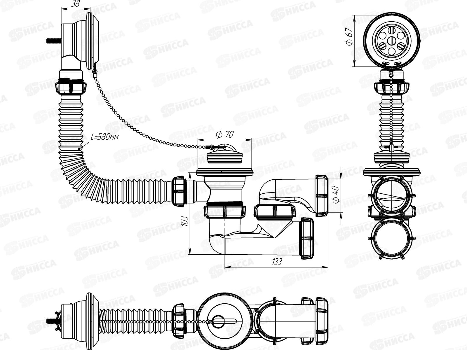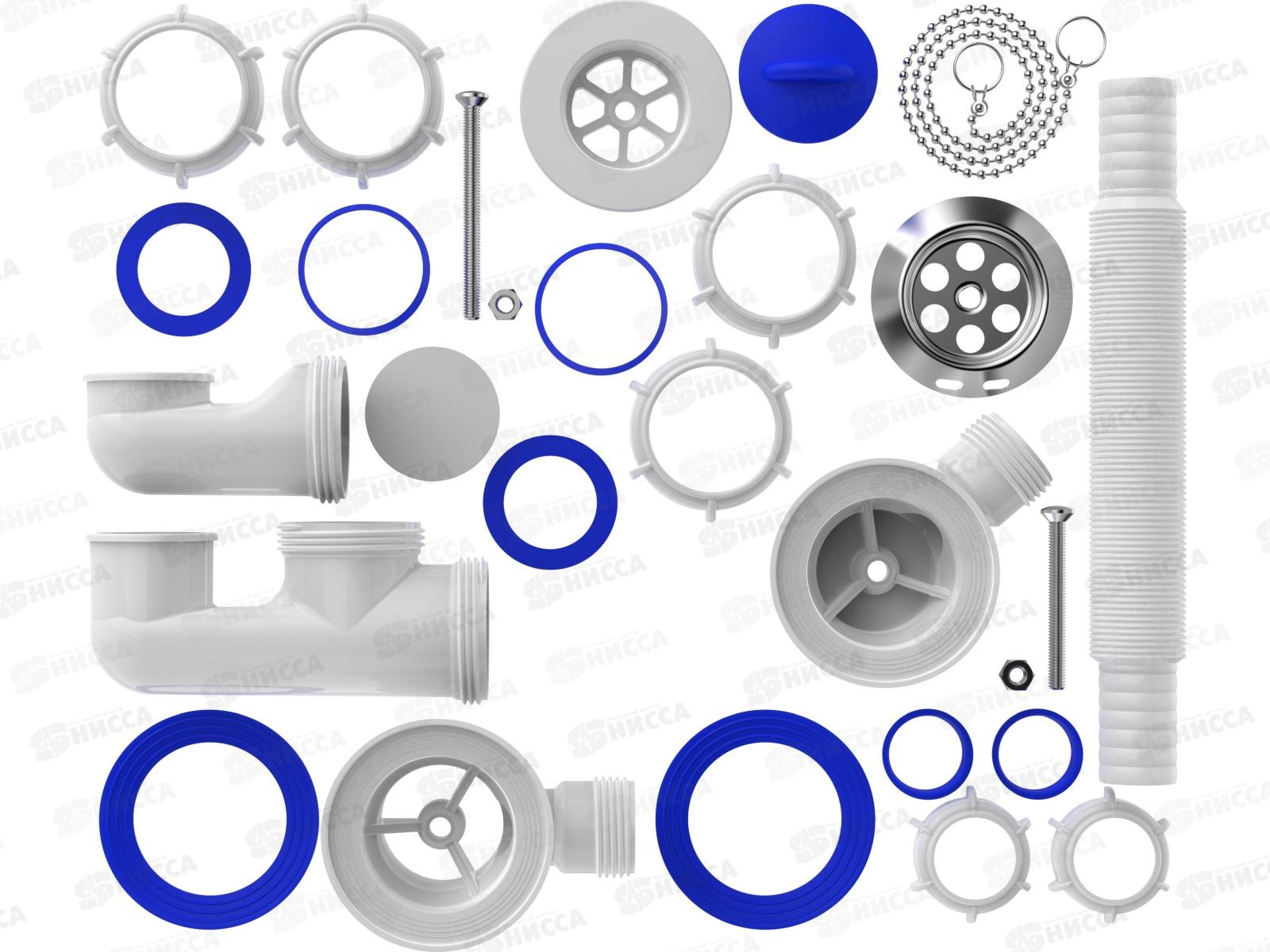 Сифон для ванн регулируемый. Выпуск с пластиковой решеткой O70мм спроектирован под стандартный диаметр сливного отверстия ванн O50мм. Подходит для всех типов ванн, в т.ч. чугунных. Решетка крепится на винт 60мм и шестигранную гайку М6. Перелив с трубкой длиной 50см и металлической решеткой. Колено сифона регулируемое с высотой гидрозатвора 50 мм, имеет ревизионное отверстие, заглушенное прокладкой и гайкой, для легкой прочистки сифона без его демонтажа, а Г-образная трубка отвода позволяет направить гофротрубу слива в нужную сторону. Труба отвода в канализацию или гофротруба приобритается отдельно. Скорость слива: 25 л/мин. В комплекте идет прокладка-бабочка из термоэластопласта (ТЭП), который не вступает в реакцию в акриловыми ваннами. Пробка для перекрытия воды из ТЭПа, на цепочке. Полная комплектация, все гайки, прокладки и схема установки в комплекте.
