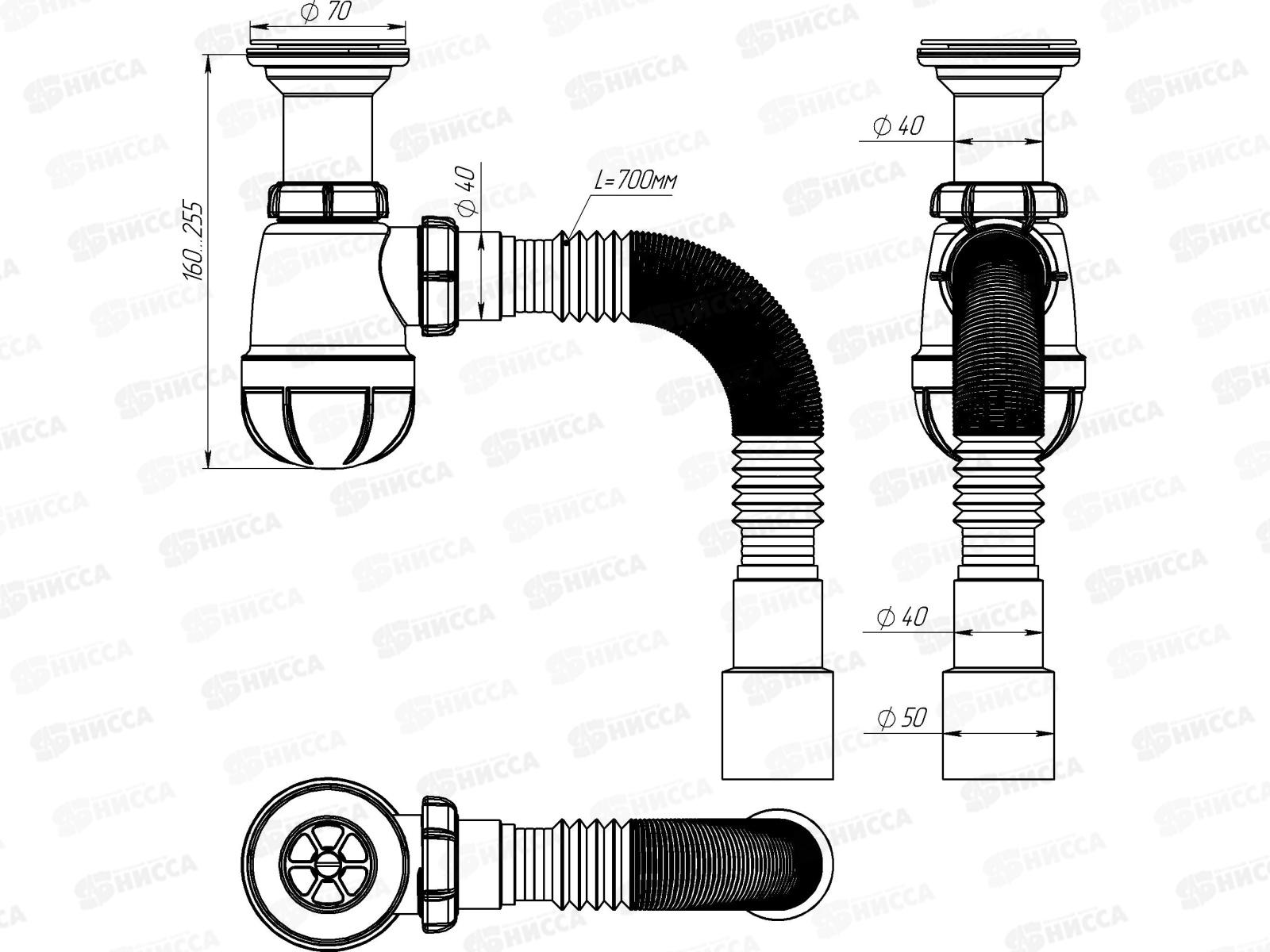 Сифон бутылочного типа от бренда Aquant для раковин и моек с диаметром сливного отверстия 50 мм и решеткой 70мм. Выпуск 1 1/2" - литой, удлиненный, без перелива, с пластиковой белой решеткой 70 мм. Корпус сифона увеличенный, для достижения максимальной проточности и поддержания оптимального уровня гидрозатвора с высотой 55мм. Идет в комплекте с гофротрубой с универсальным выходом под два диаметра 40/50мм для подключения к канализации. Сифон прост в установке, позволяет прочистить его в случае засорения без демонтажа и способен улавливать мелкие предметы, например, кольца или серьги. Конструкция корпуса сифона Аквант имеет эксклюзивный дизайн и запатентована патентом на промышленный образец. Внутренняя поверхность стакана сифона с зеркальной полировкой обеспечивает улучшенную проточность. Все пластиковые детали сифона производятся из первичного полипропилена с добавлением снежно-белого красителя. Прокладки изготовлены из высококачественных пластикатов (TPE, PVC, LDPE) и обеспечивают длительный срок службы и высокую ремонтопригодность. Сифон выдерживает перепад температур от +5 до +80 градусов. Все необходимые прокладки, гайки и винты в комплекте