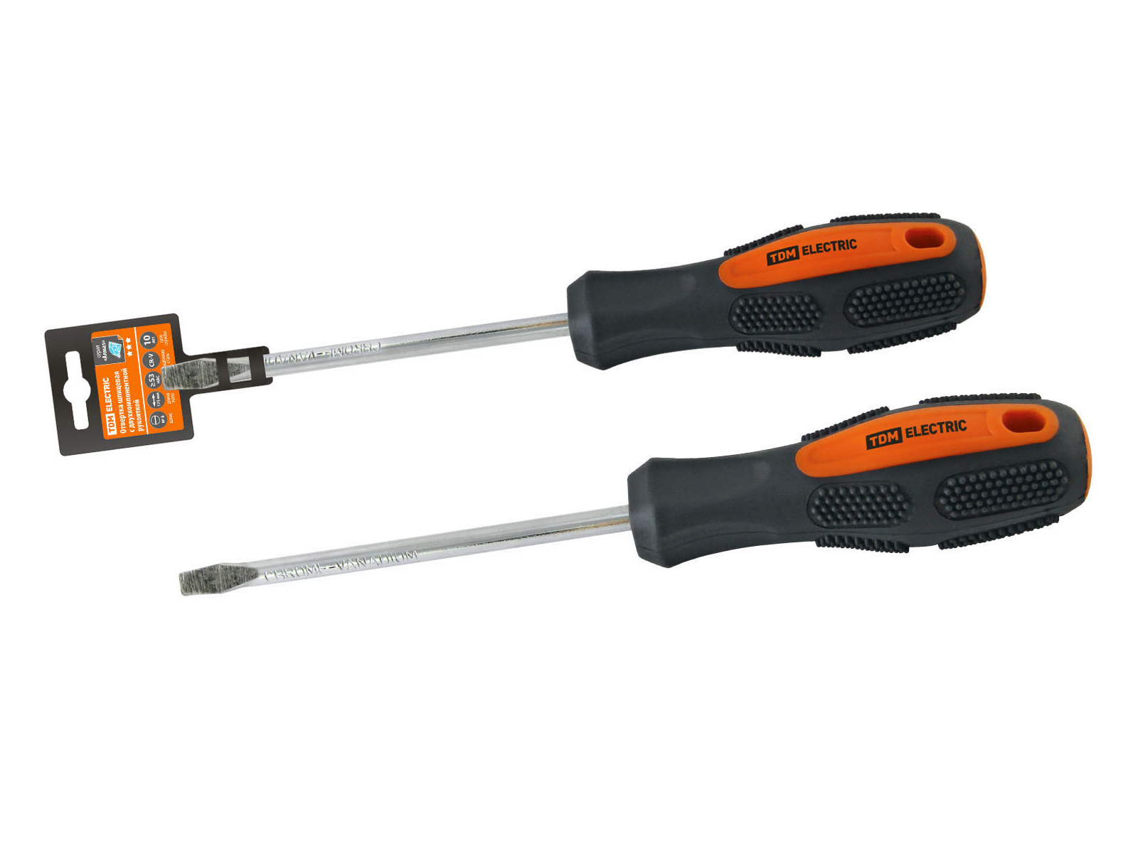 Отвертка TDM, серия «"Алмаз"», шлицевая, двухкомпонентная, SL8.0x175. Отвертка слесарно-монтажная предназначены для монтажа и демонтажа крепежных элементов со шлицевыми и крестовыми головками. Стержень и рабочая часть отвертки изготовлены из закаленной хром-ванадиевой стали (CR-V). Двухкомпонентная массажная рукоятка выполнена из пластика и термопласт-резины. Надежная сталь наконечника и стержня (CR-V). Намагниченный наконечник для удержания крепежа. Комфортная и удобная рукоятка для длительной работы. Полный ассортимент наиболее востребованных видов отверток.