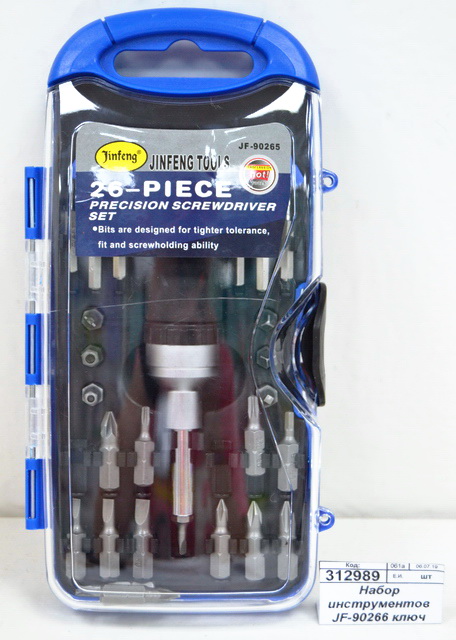 Набор инструментов 26 предметов представляет собой ключ - трещетку с насадками, который помещен в компактный кейс с прозрачной крышкой.