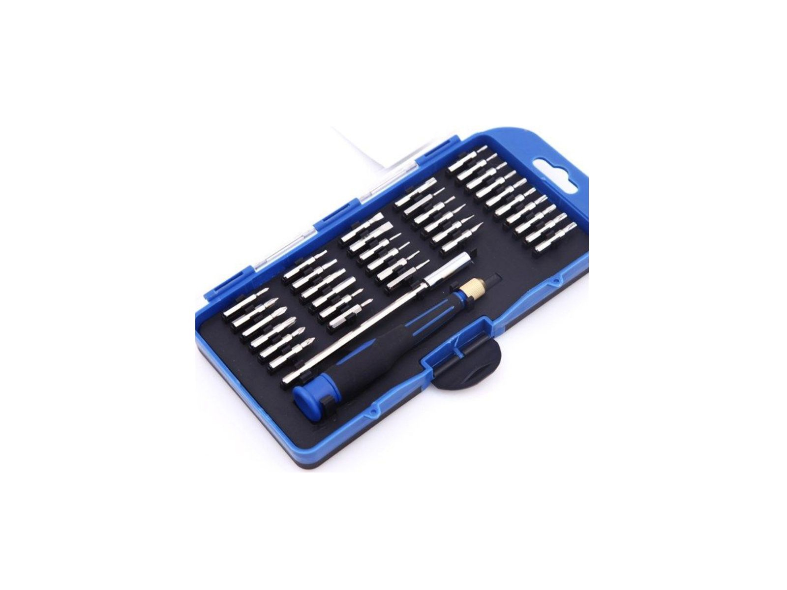 Набор инструментов 34 предмета представляет собой рукоять для бит и набор бит, который помещен в компактный кейс с прозрачной крышкой.