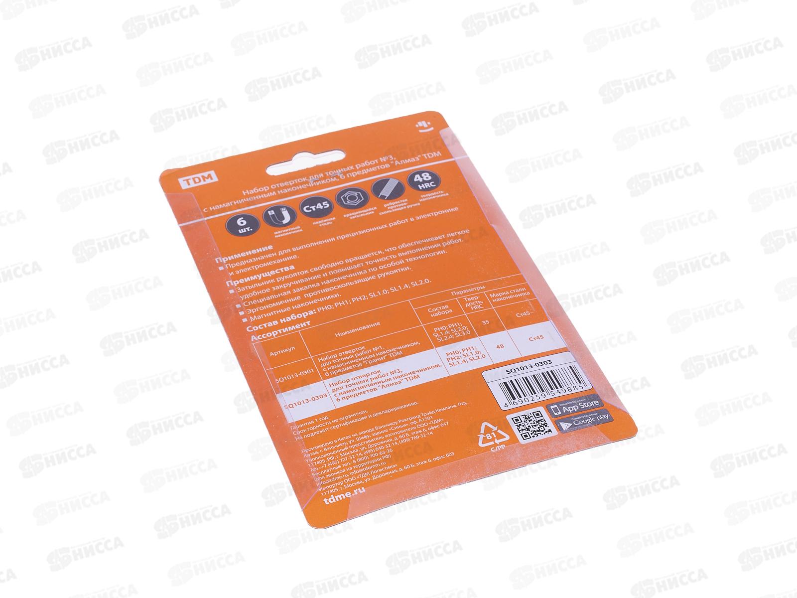 Набор отверток для точных работ № 3, с намагниченным наконечником, 6 предметов "Алмаз" TDM SQ1013-0303 предназначен для выполнения прецизионных работ в электронике и электромеханике. А именно: ремонт и регулировка бытовой техники, мобильных устройств, электроники, работа с миниатюрным крепежом на производственных и сборочных участках. Стержень и двухкомпонентная рукоять плотно соединены друг с другом. Это повышает надежность использования и упрощает эксплуатацию. Комплект поставляется в пластиковом боксе.