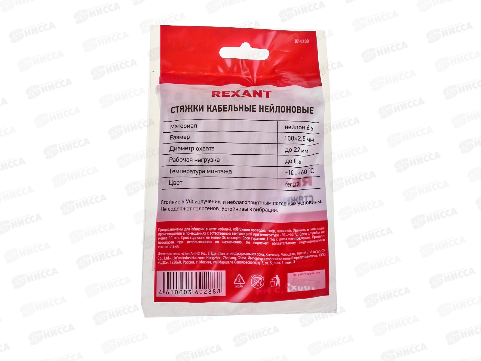 Стяжка кабельная 100*2.5мм 100шт белый нейлон Rexant *10/300